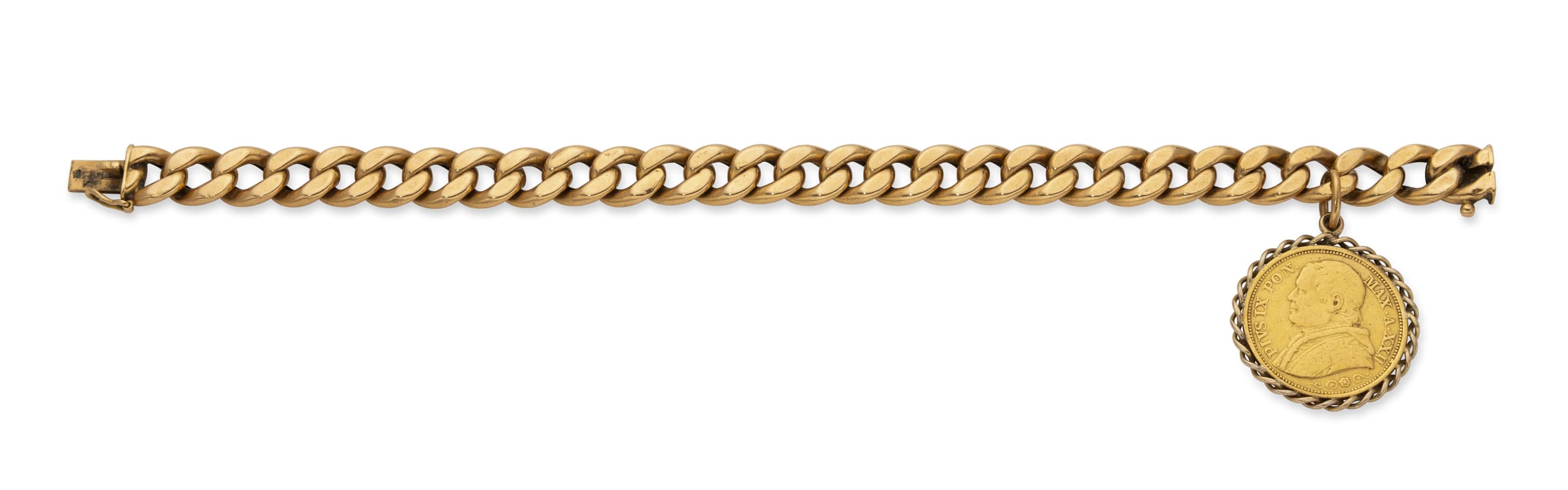 18K GOLD BRAIDED BRACELET WITH PAPAL STATES 20 LIRE GOLD COIN, POPE PIUS IX, DATED 1867