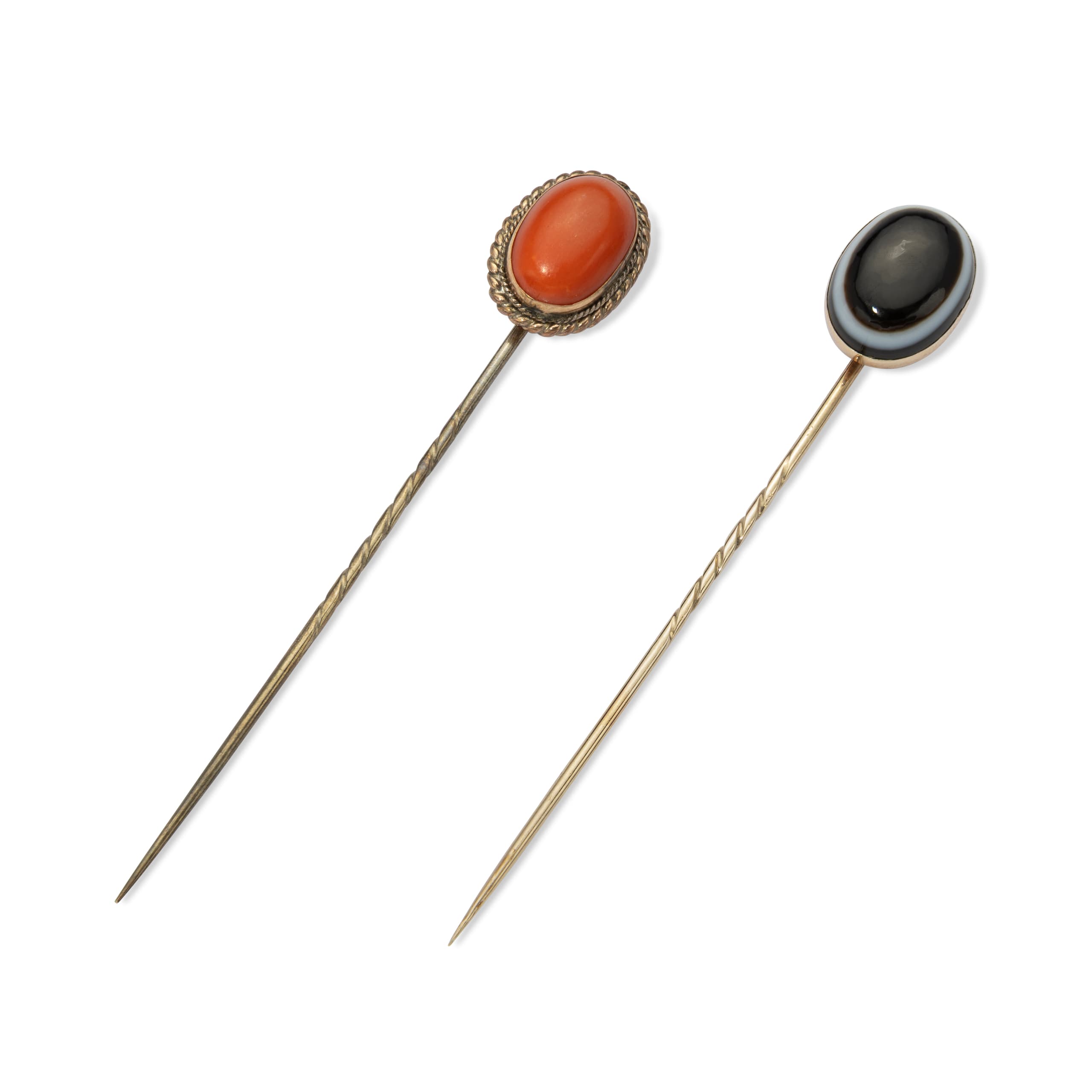 including one pin decorated with a coral cabochon and one pin decorated with black and white two-tone chalcedony total gross weight: 7.32 gr.