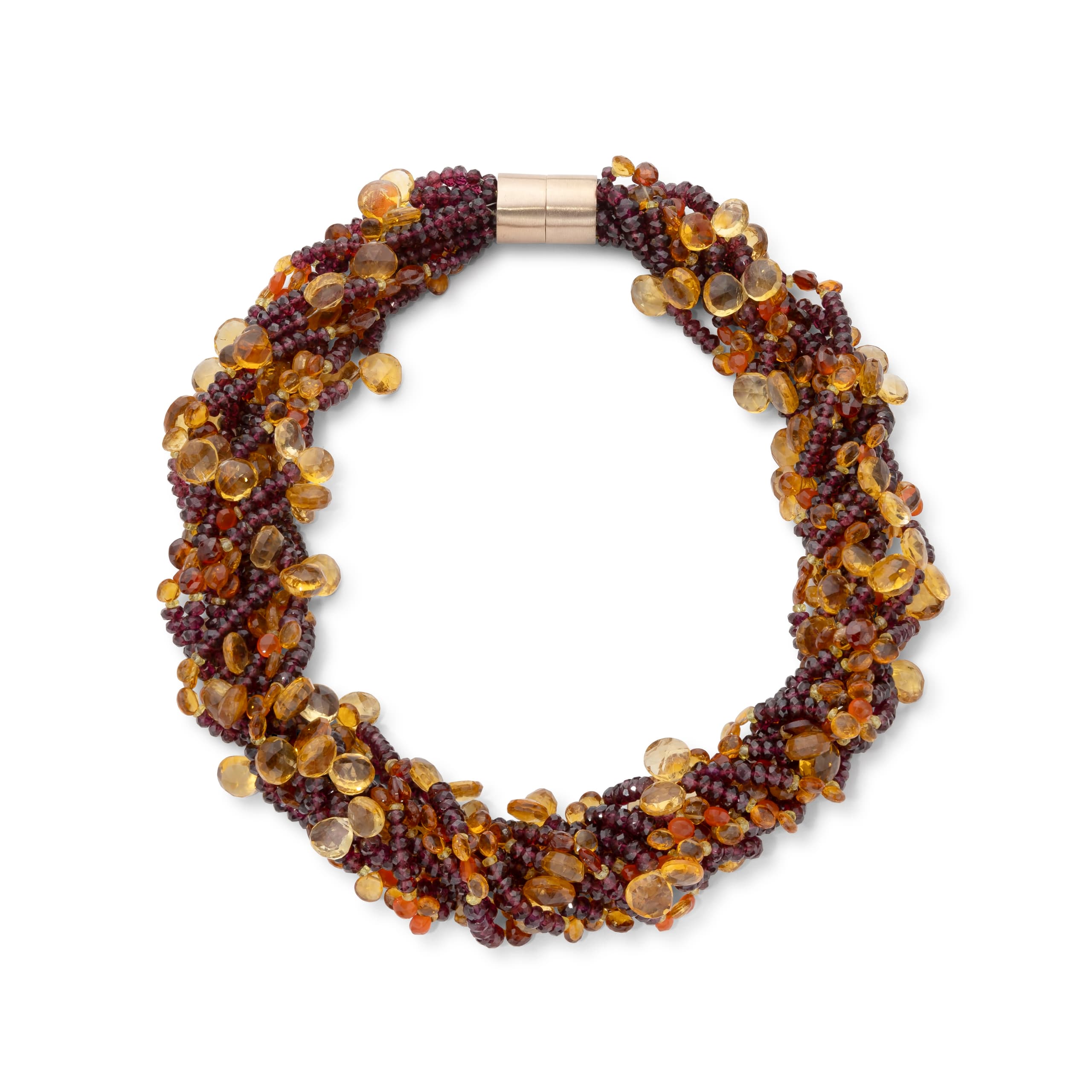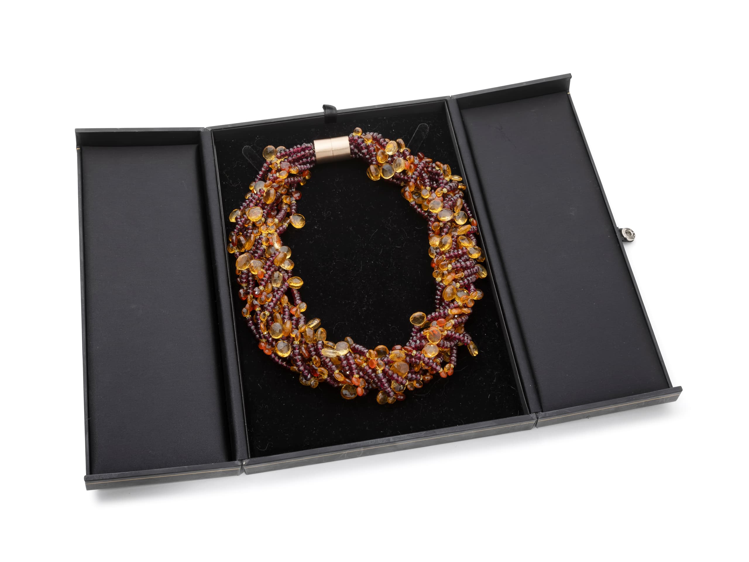 Necklace with ten rows of faceted garnet beads, citrines and silver sterling magnetic clasp L. 50 cm