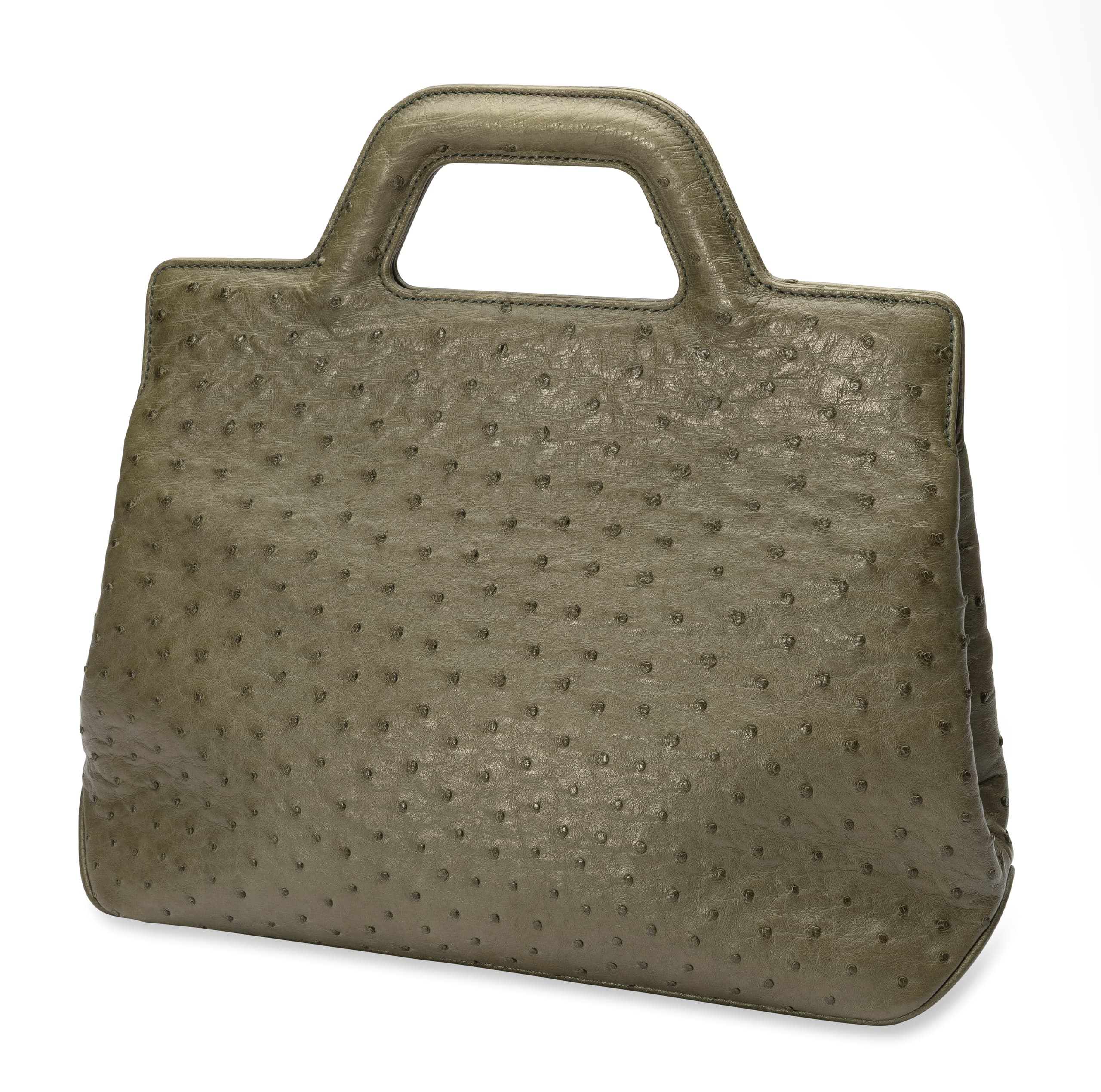 Ferragamo handbag in khaki ostrich leather with iconic Gancini clasp.