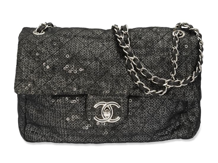 CHANEL BLACK AND SILVER SEQUIN FLAP BAG