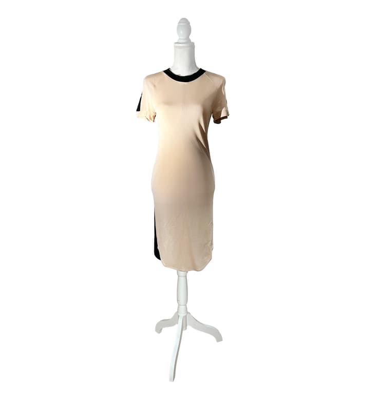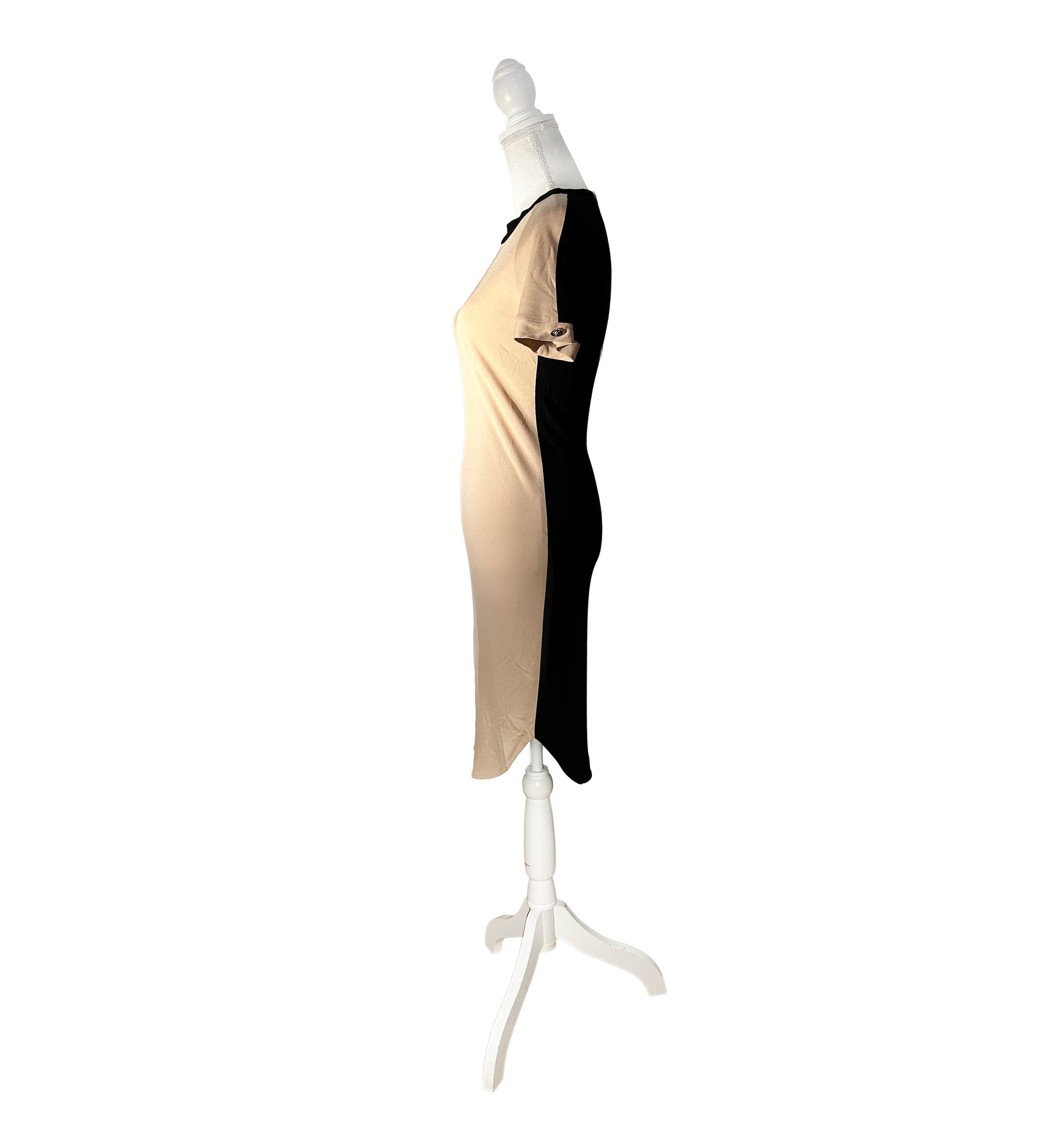 short sleeves, buttons with lion head on the sleeves, black at the back, beige at the front runway look 38 size 38 100% viscose labelled ‘Chanel’, ‘Made in Italy’