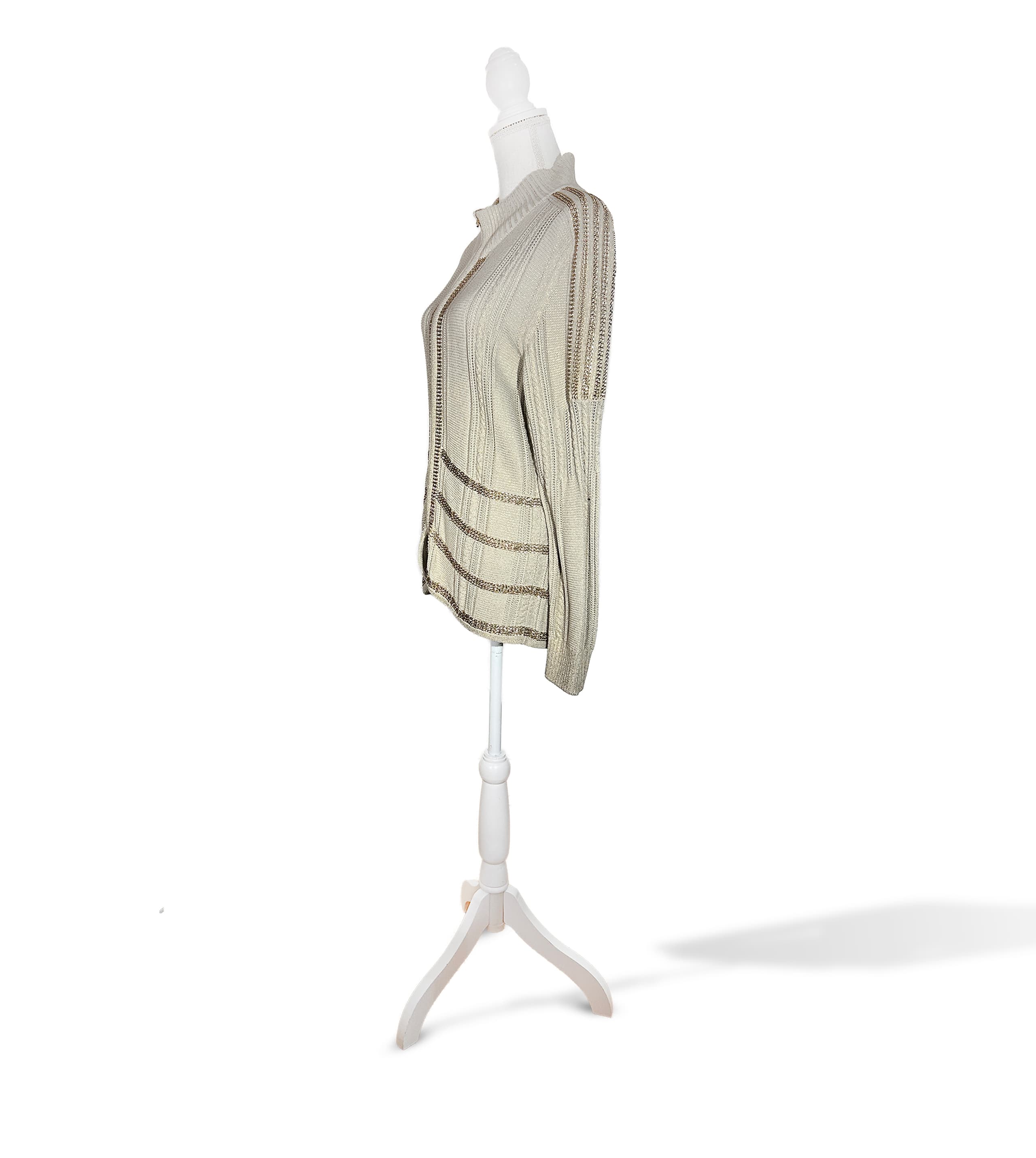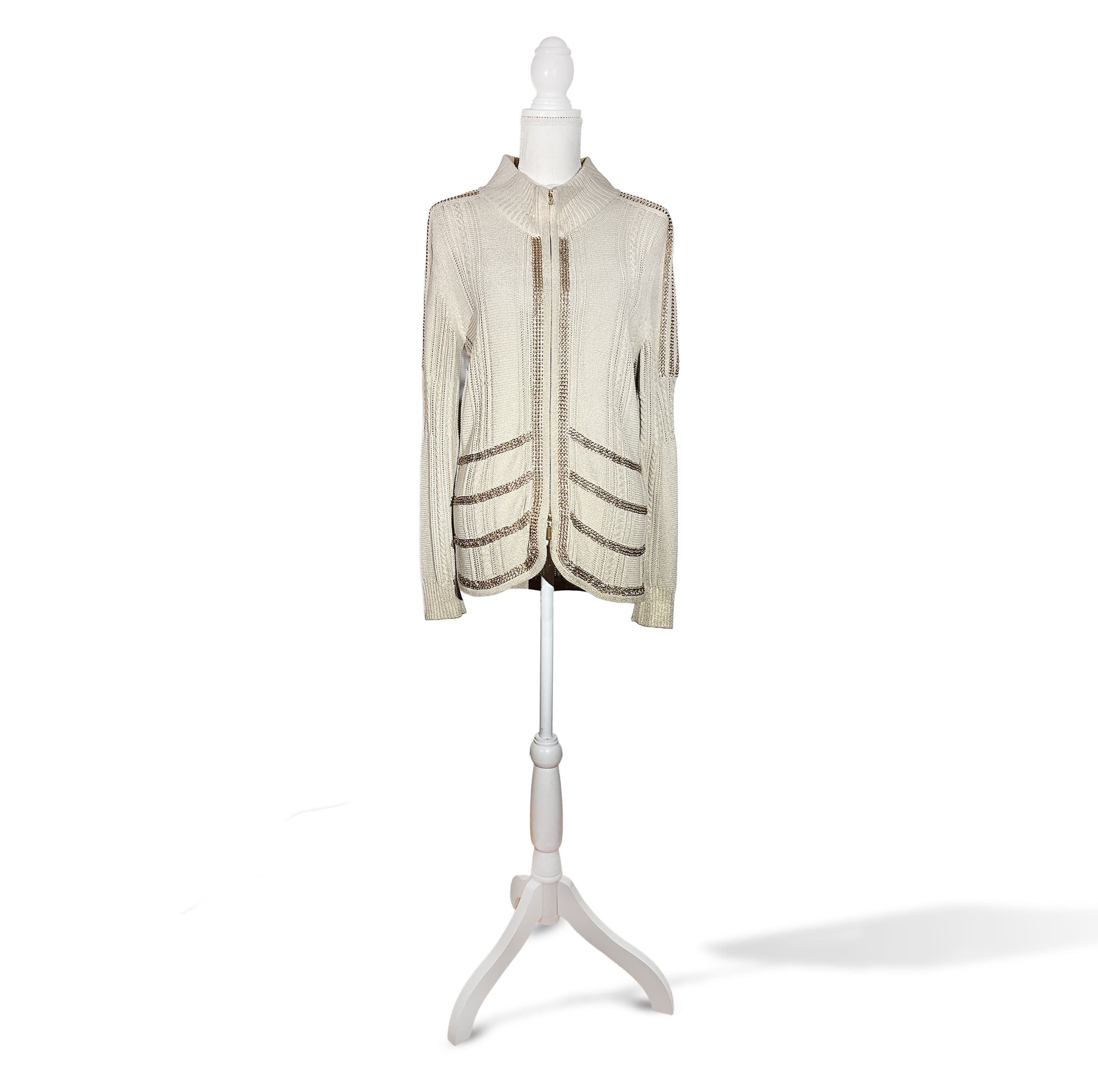 Taupe and brush gold knit cardigan embellished with gold metal chains
