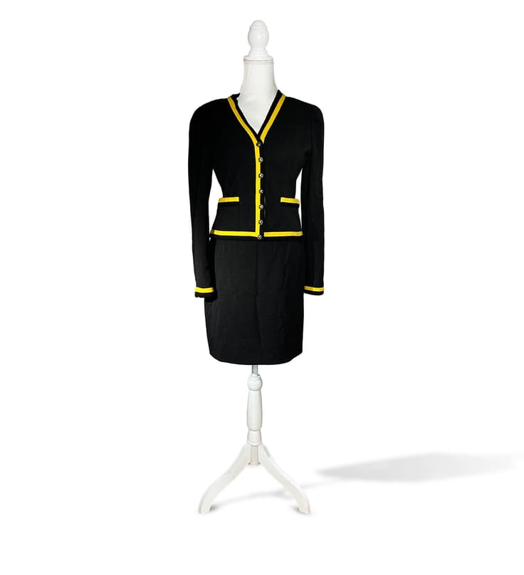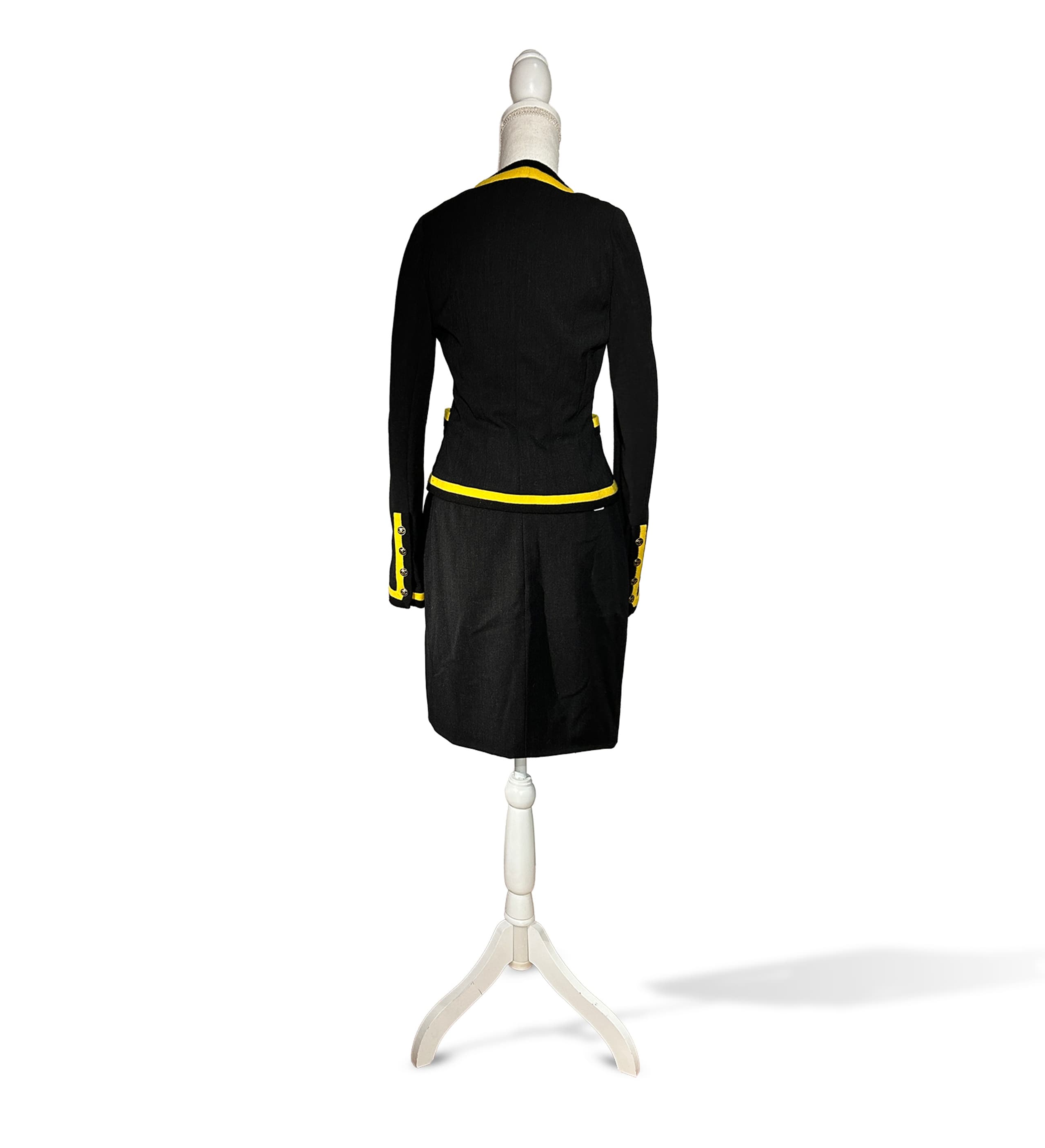jacket with yellow trim along the collar, button placket, sleeves and pockets, buttons with CC logo; straight black skirt runway presented by Naomie Campbell, look 96 size 40 jacket: 96% wool, 4% elastane / lining: 95% silk, 5% elastane skirt: 96% wool, 4% lycra / lining: 95% silk, 5% elastane