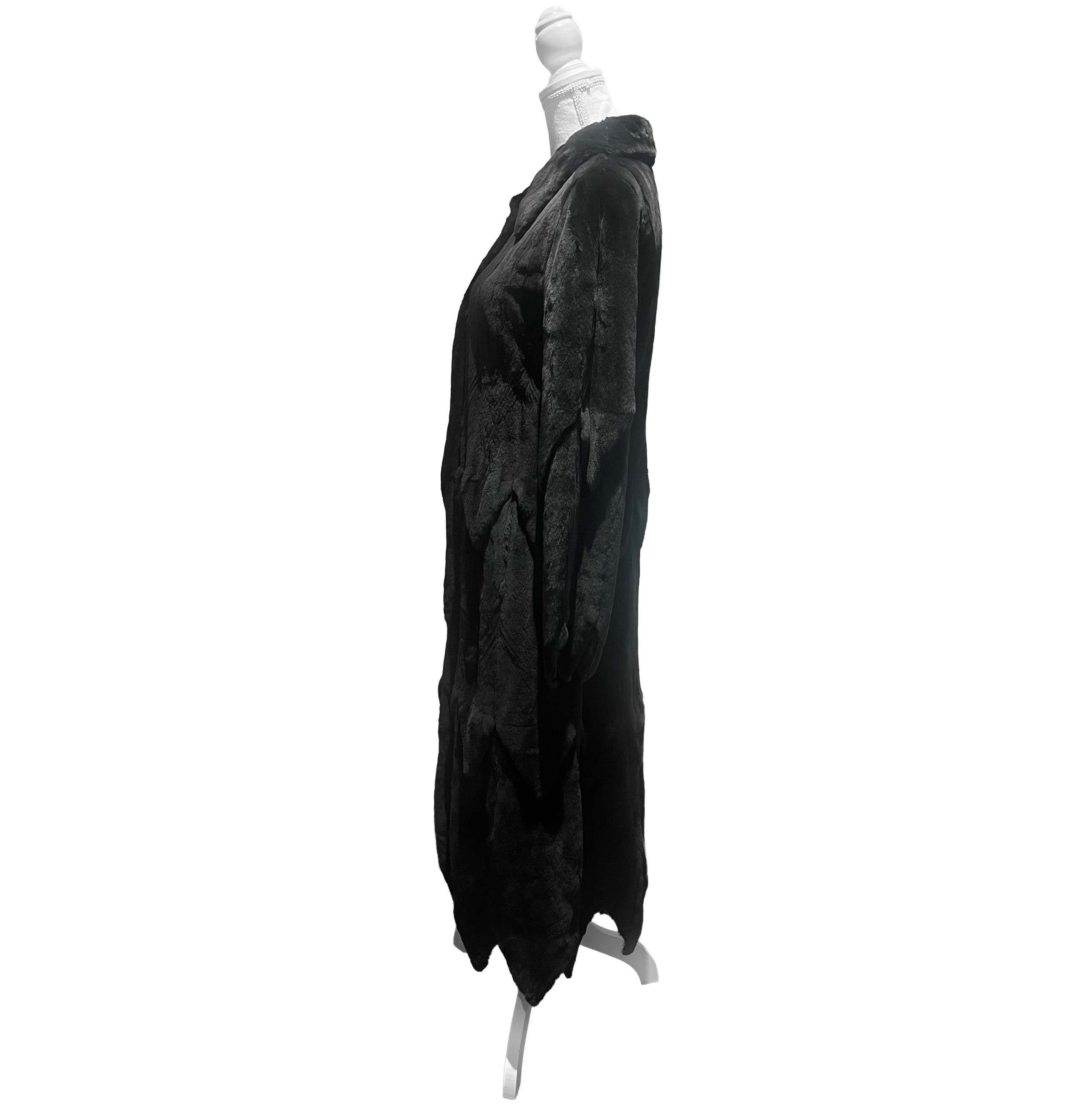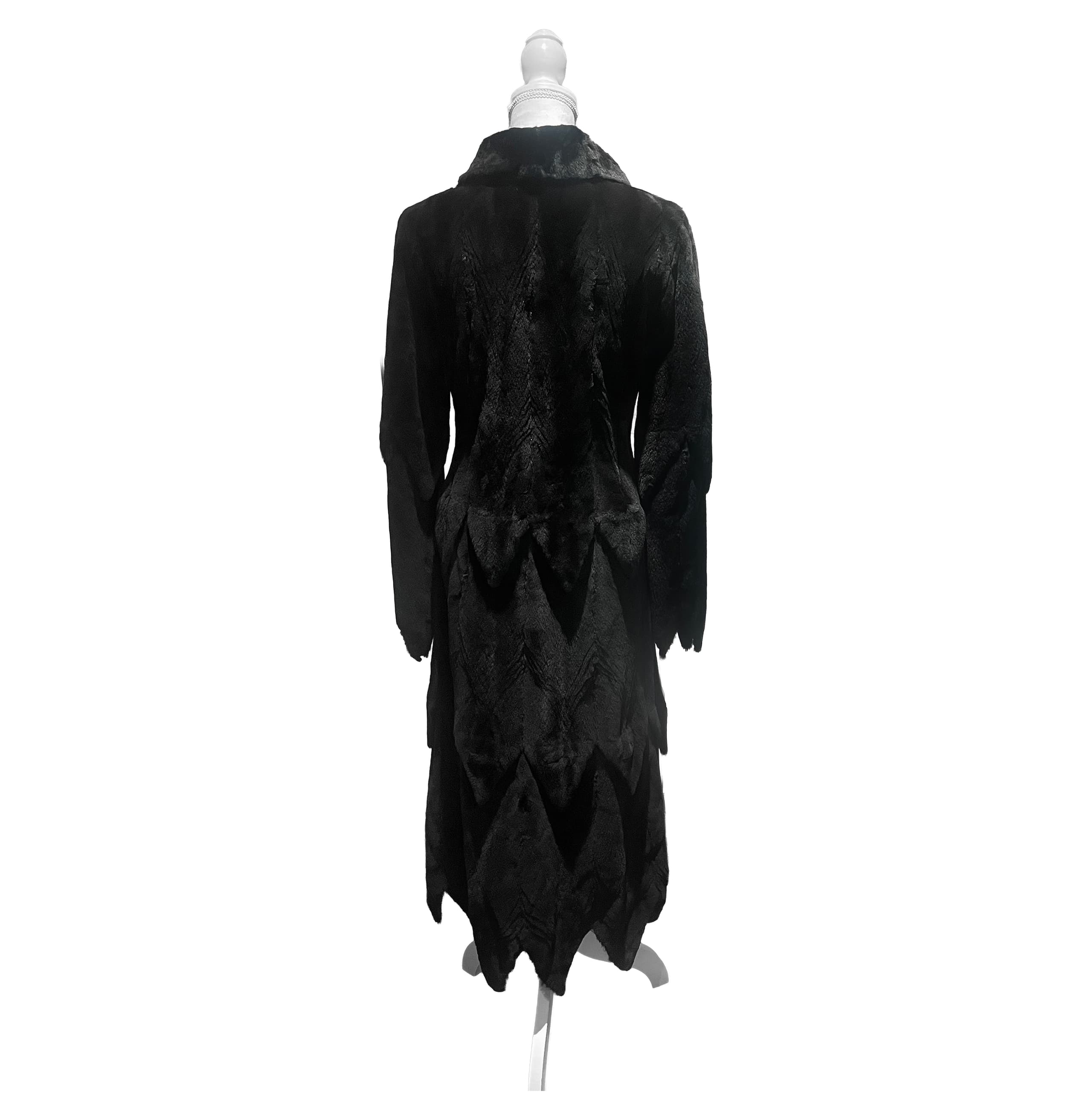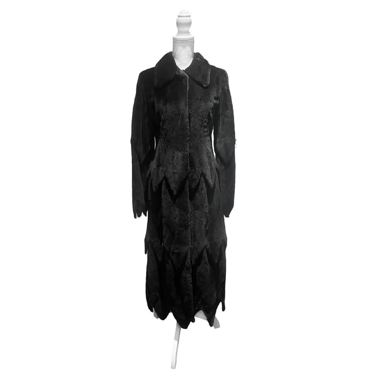 The coat is composed of three overlapping panels, each cut into pointed shapes. The sleeves are finished with pointed edges. 100% Fur 100% Silk linning approx. European size 36-38 arm length: 67.5 cm shoulder to bottom: 123 cm shoulder to shoulder: 38.5 cm labelled ‘Wunderkind couture’ / ‘made in Germany’