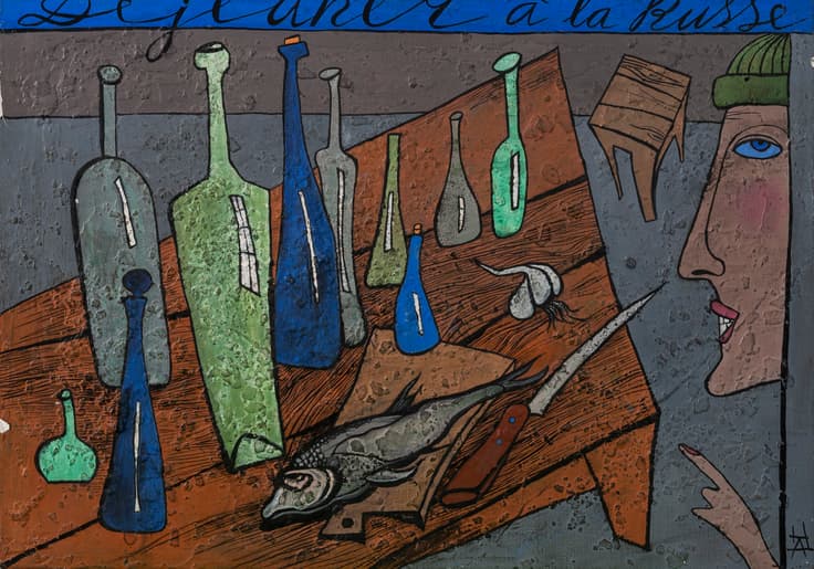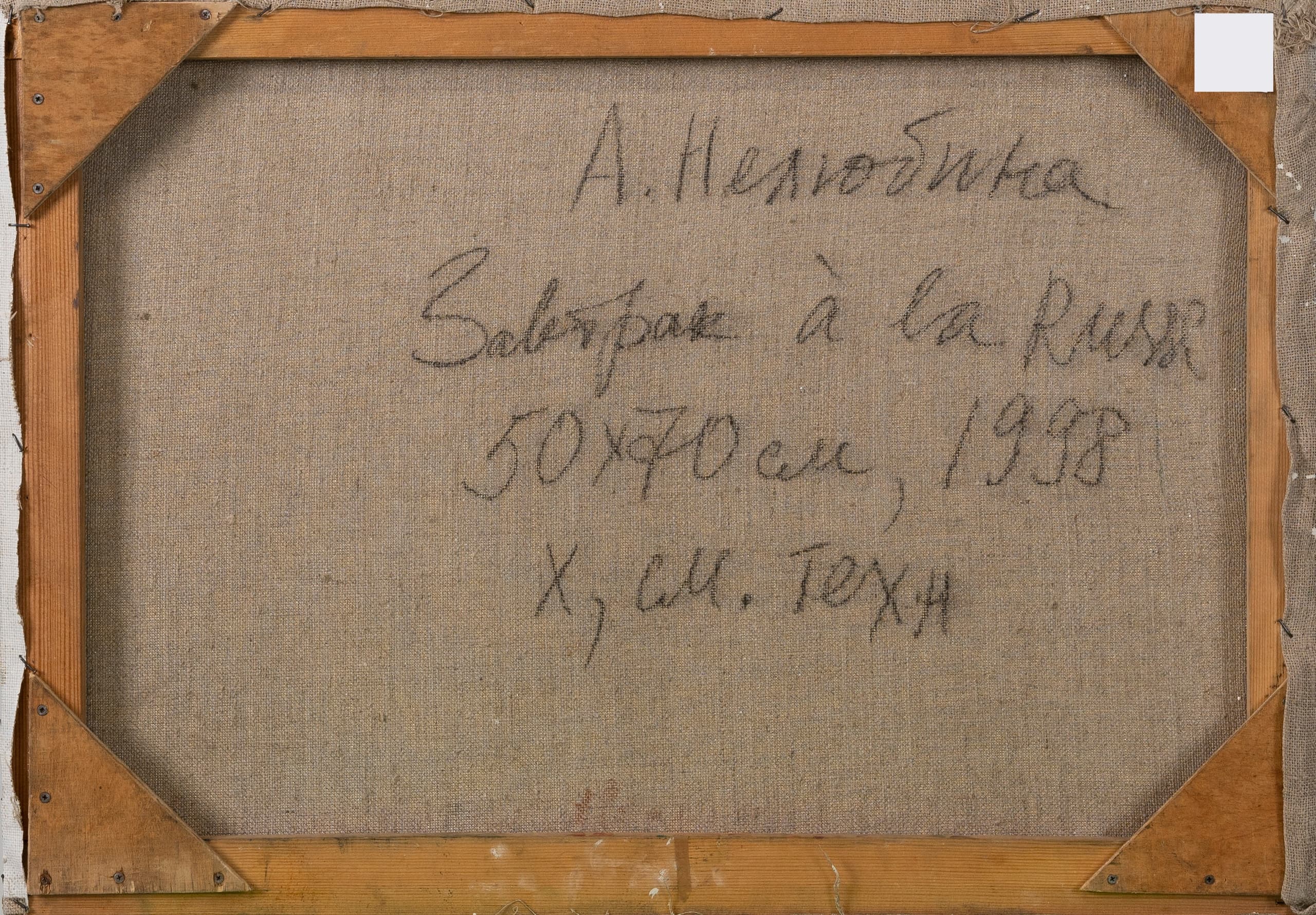 signed with initials in Cyrillic ‘NA’ (lower right), titled ‘Déjeuner à la Russe’ (along the upper edge); signed, titled, dated in Cyrillic (on the reverse) mixed media on canvas 50 x 70 cm painted in 1998