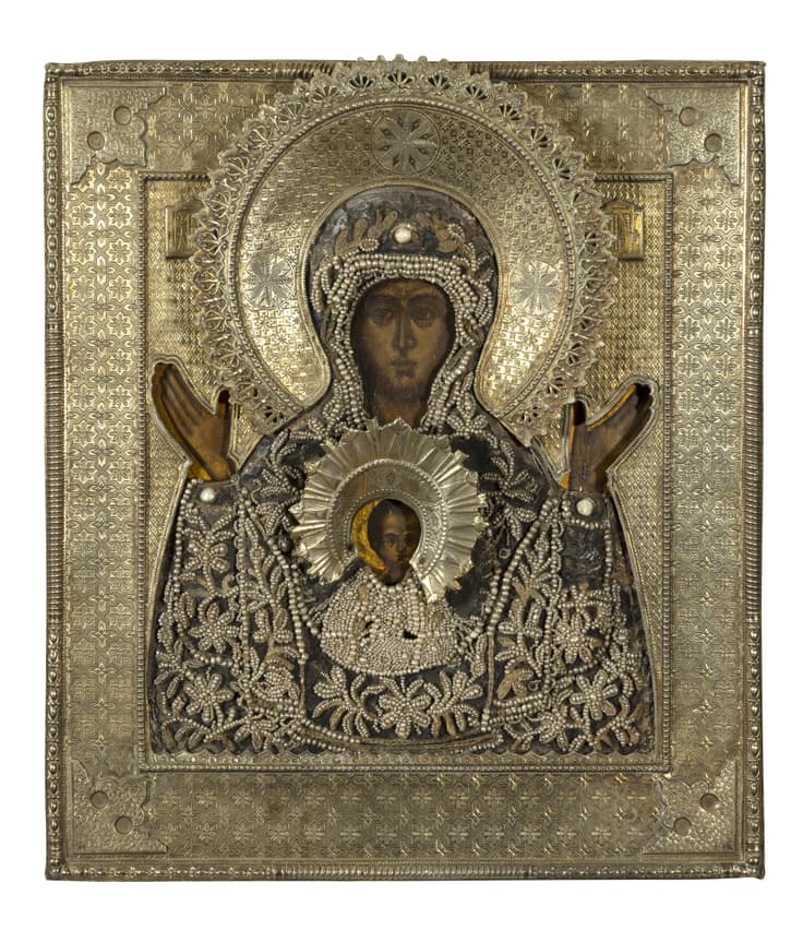 ICON ‘THE MOTHER OF GOD OF THE SIGN (ZNAMENIYE)’ IN GUBKIN SILVER AND PEARL OKLAD Moscow, mid-19th century