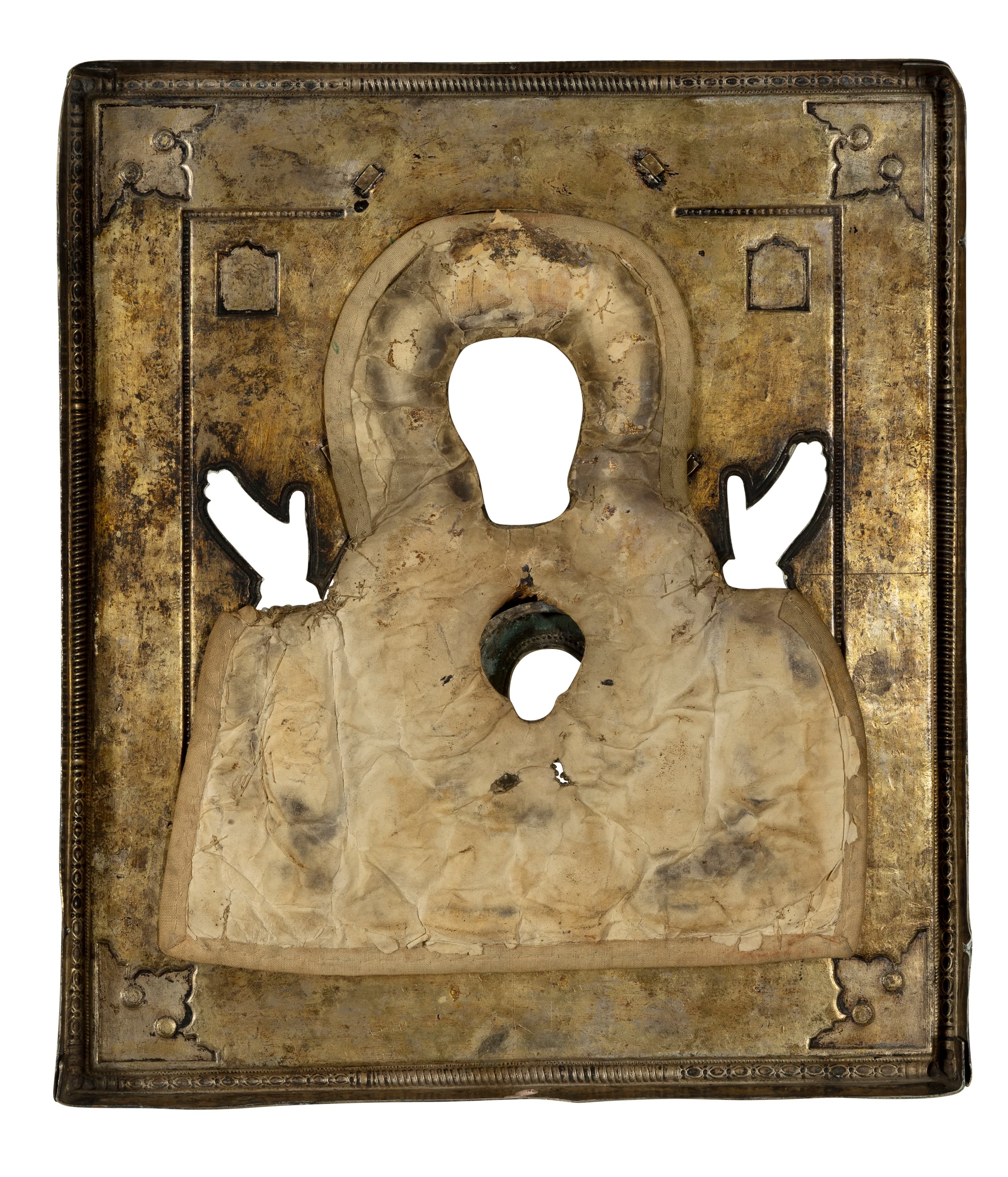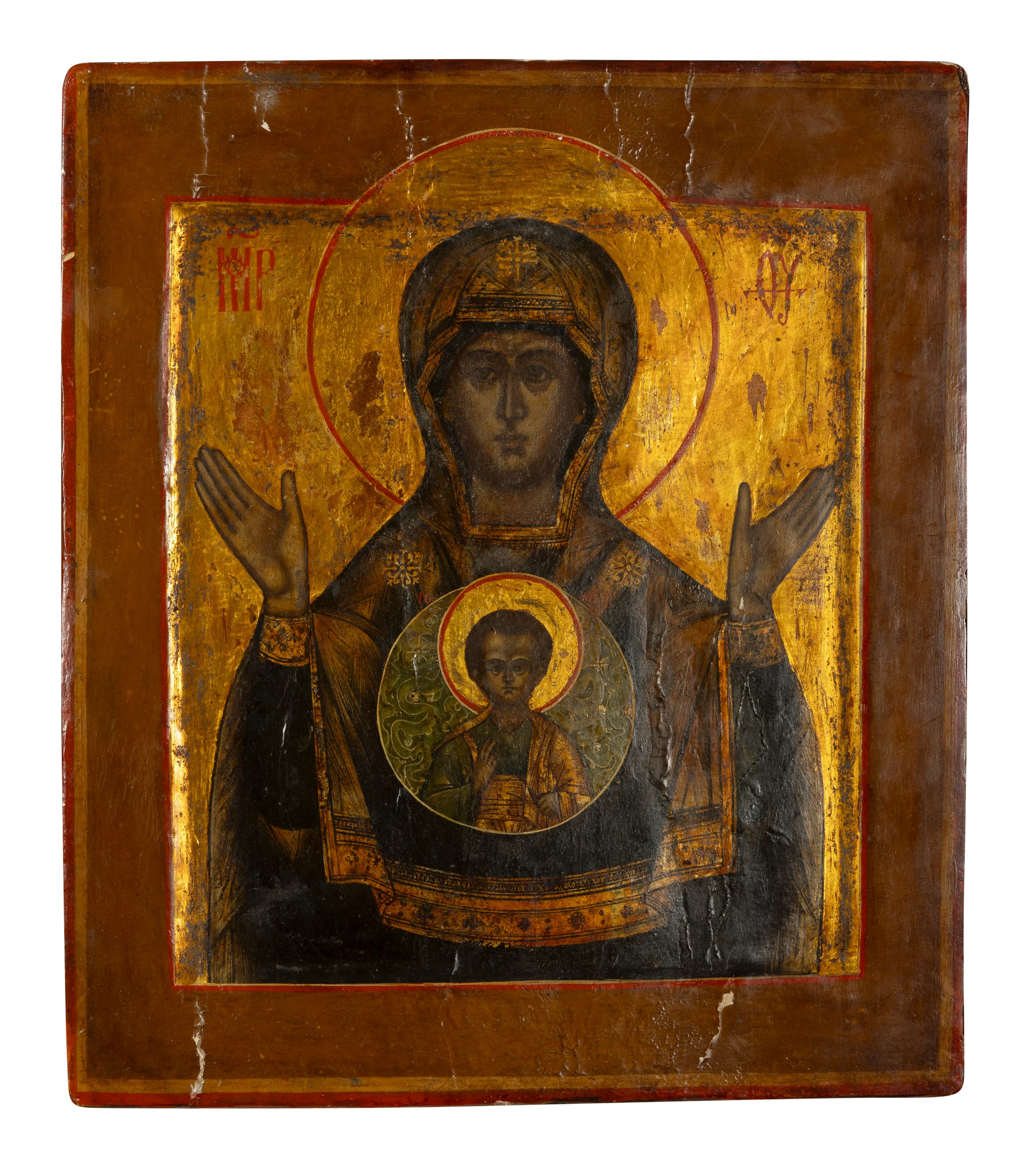 The icon, decorated with laconic and elegant ornamentation, is of high collectible value as a work by the famous master Ivan Semenovich Gubkin. ‘The Sign’ is the image of the Annunciation and the promise of the Birth of Christ: it shows the Mother of God with her hands raised in prayer and the Holy Child in her womb in a circle (Orante-type icon).