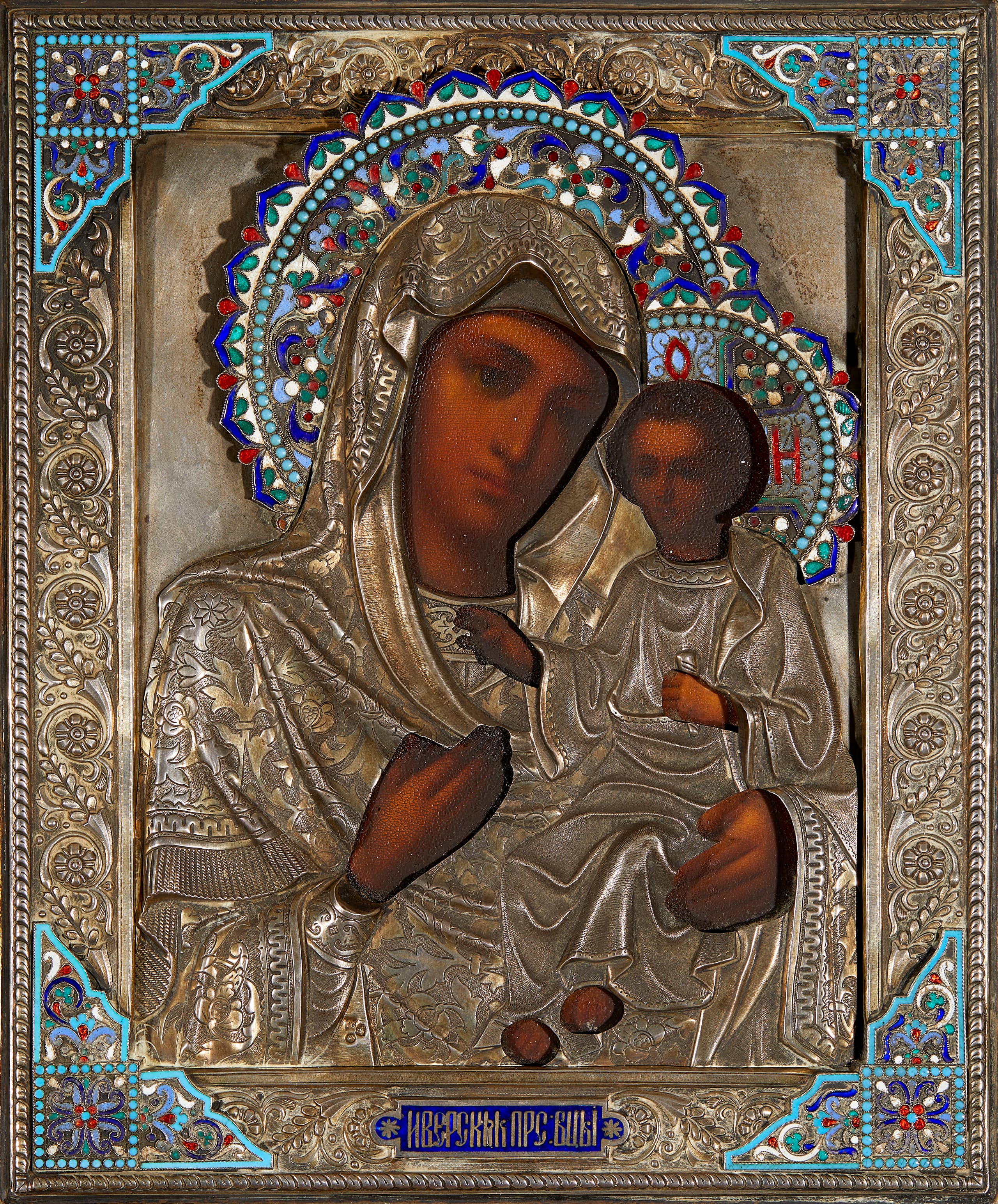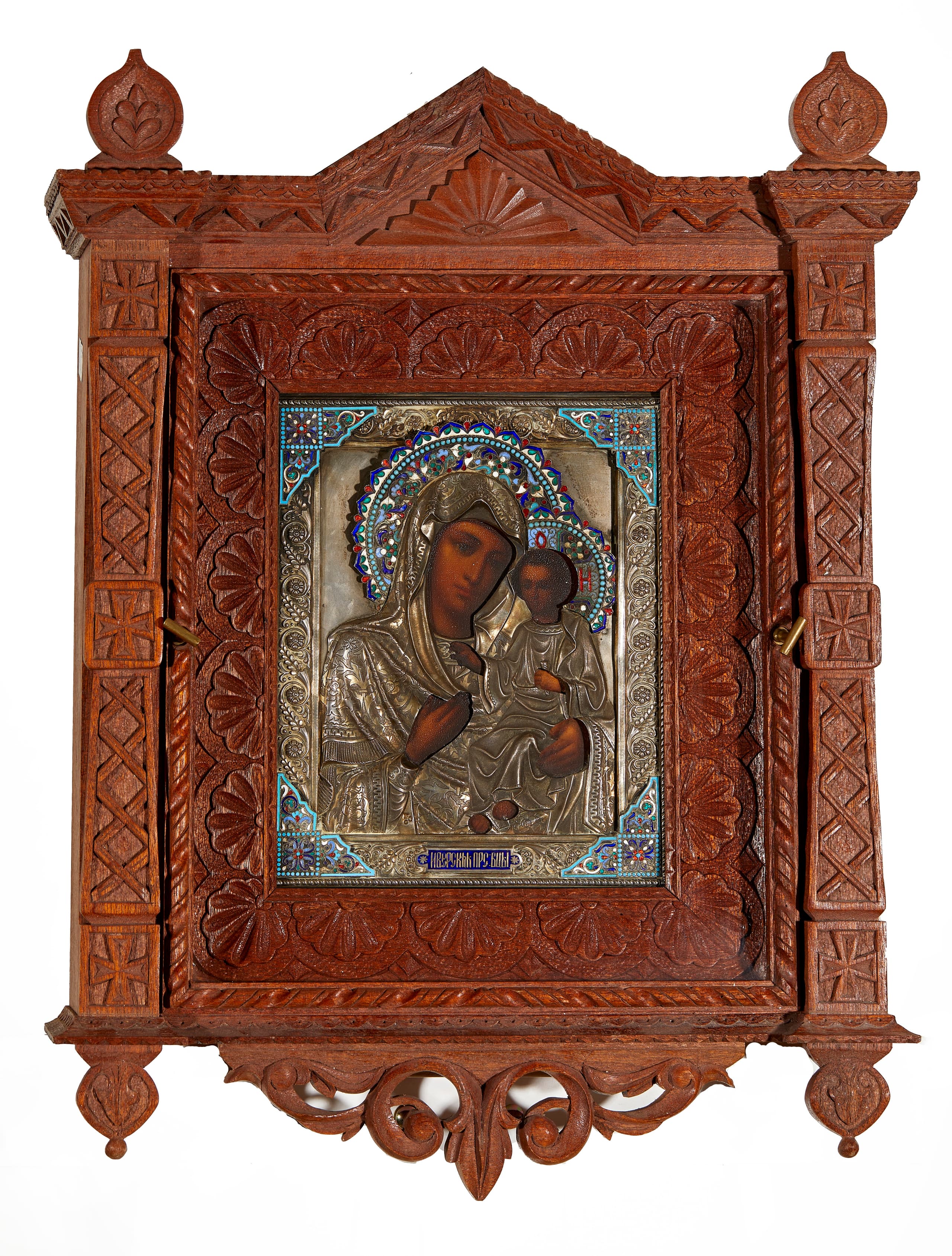 ICON 'THE IVERSKAYA MOTHER OF GOD'IN A SILVER OKLAD AND WITH A ABRAMTSEVO CASE (KIOT) Moscow, late 19th century