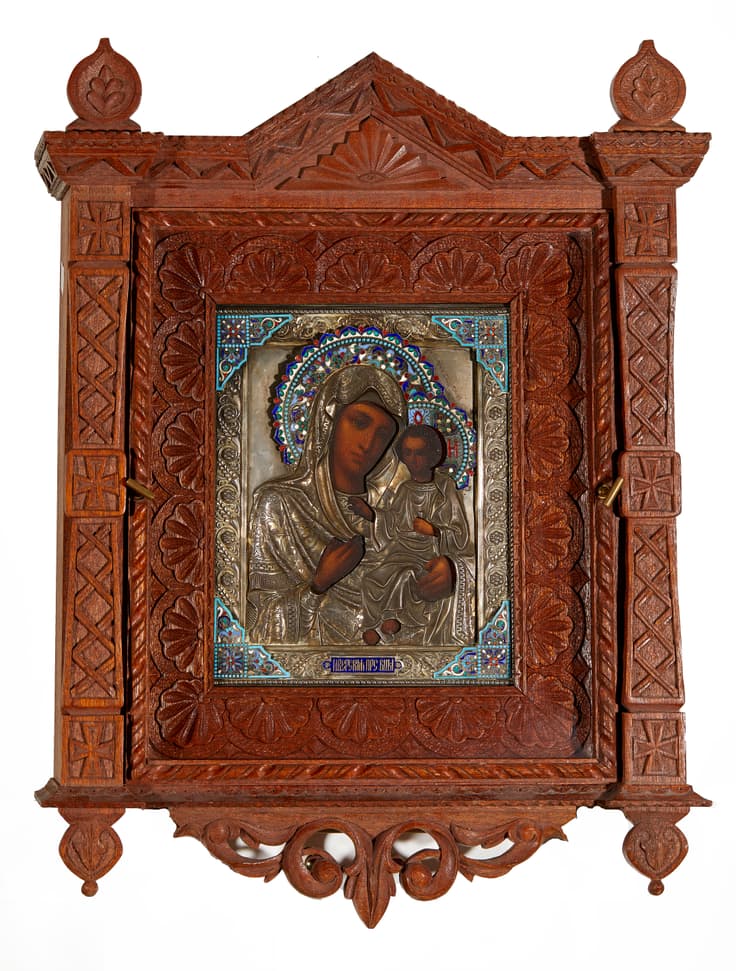 oklad: silver, chasing, engraving, gilding, enamel; hallmarks: master’s mark in Cyrillic 'G.S'for Grigoriy Sbitnev (1870-1914); assay master’s mark 'A.A'above the date '1896’, silver mark '84'and 'woman’s head in kokoshnik facing left’, the coat of arms of the city of Moscow