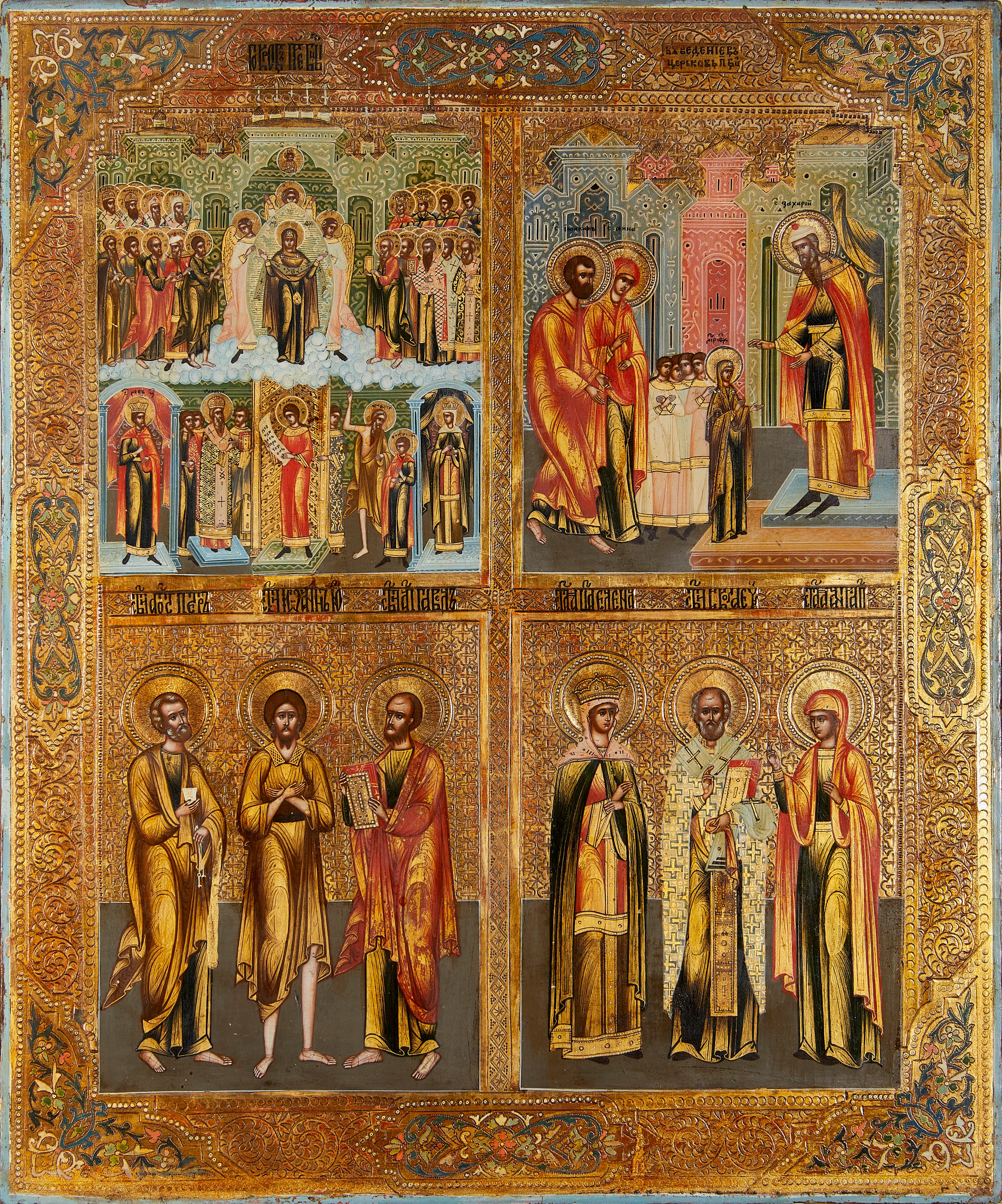 FOUR-PART ICON 'THE PROTECTING VEIL OF THE MOTHER OF GOD', 'ENTRANCE OF THE MOTHER OF GOD INTO THE TEMPLE', 'SAINTS PETER, JOHN OF MOSCOW AND PAUL', 'SAINTS HELENA, NICHOLAS AND ANNA'
