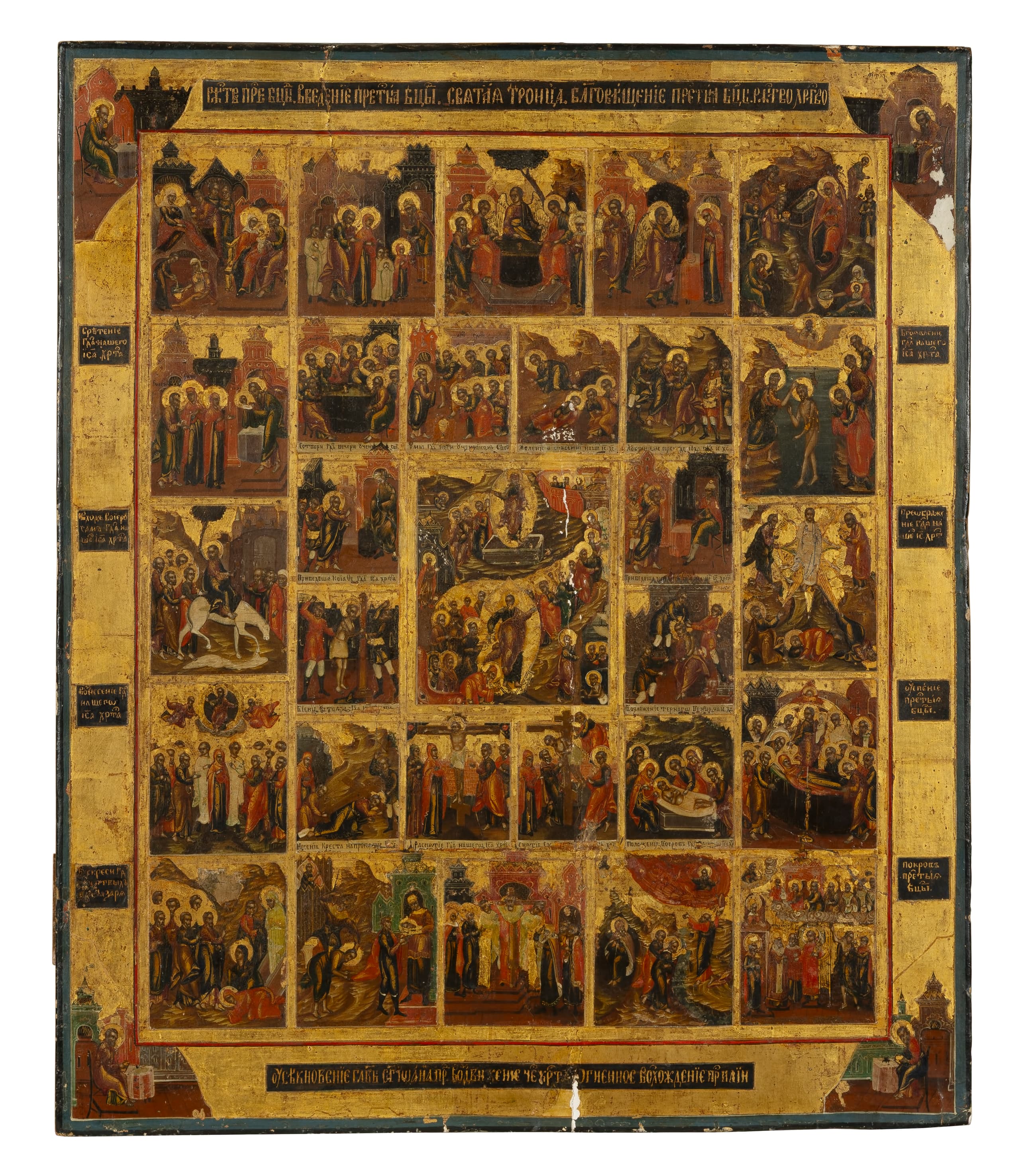 wood, levkas, gold leaf, tempera 44.4 x 37.4 cm rare with 24 feasts Condition: overall in good condition, minor losses of paint layer, fragmentary toning