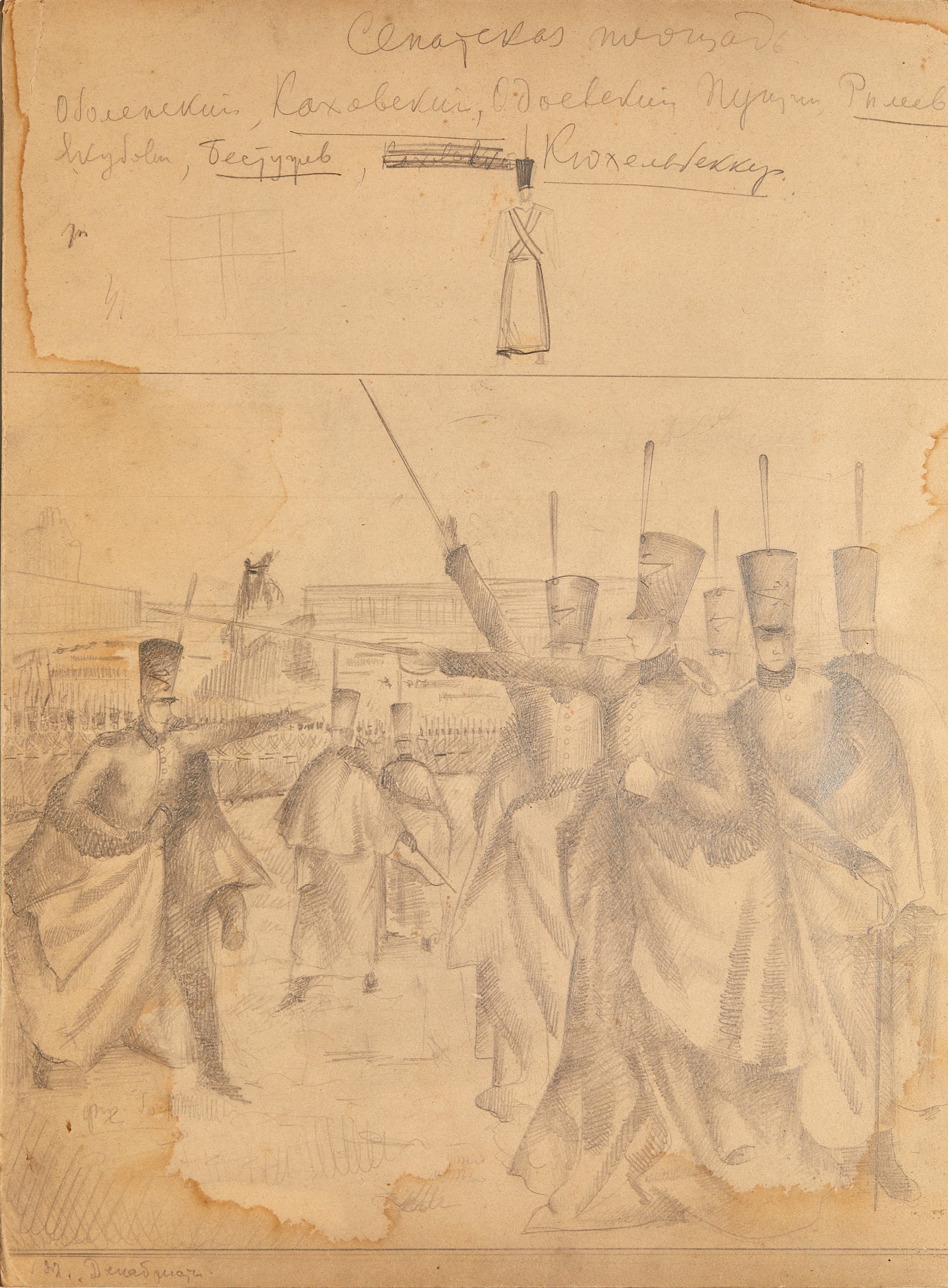 1 inscribed in Cyrillic with names of the chiefs of the troops: 'poruchik Kakhovsky, poruchik kn. Obolensky, st. captain Bestuzhev, captain Yakubovich, civilian Kuhelbeker' (upper right)