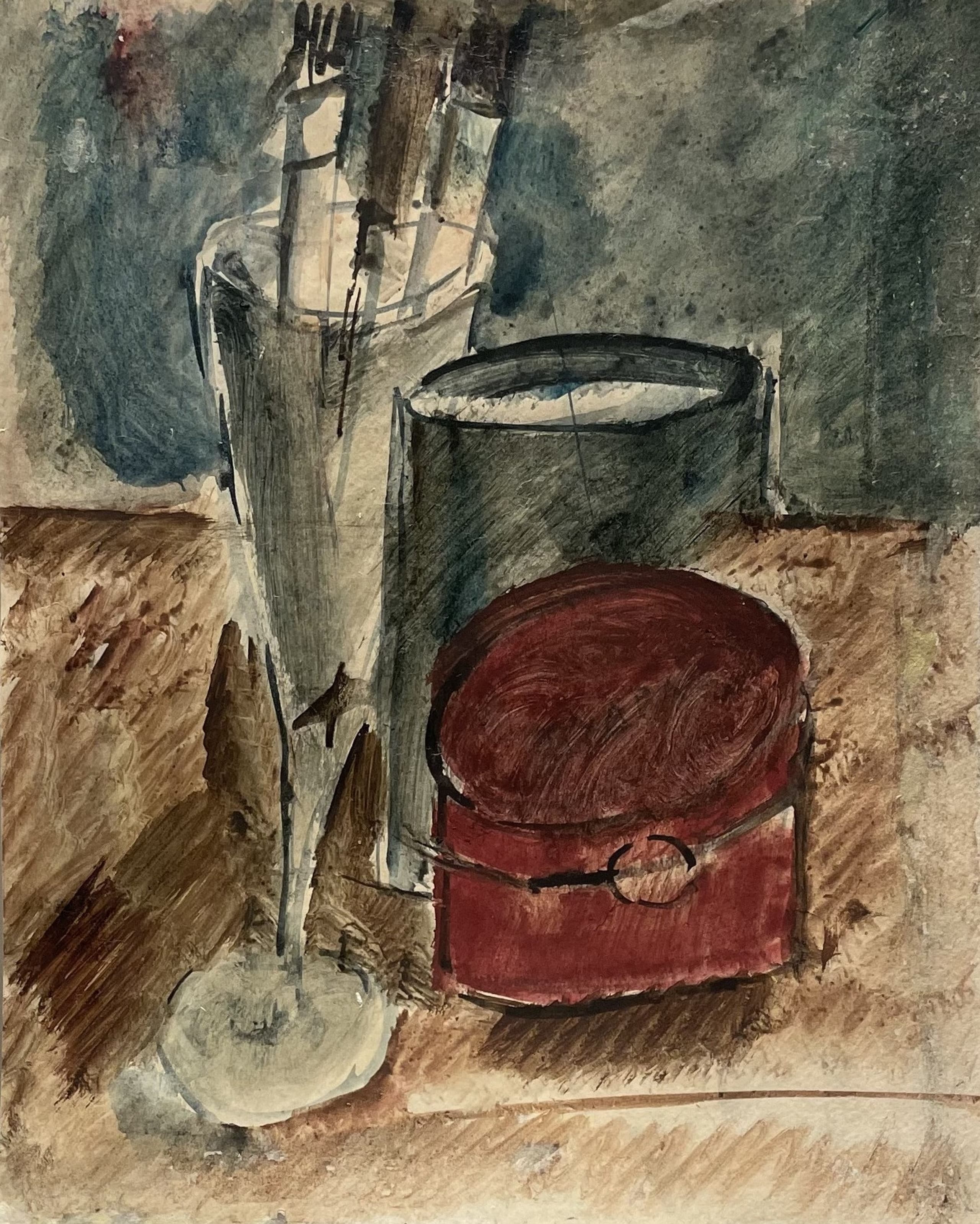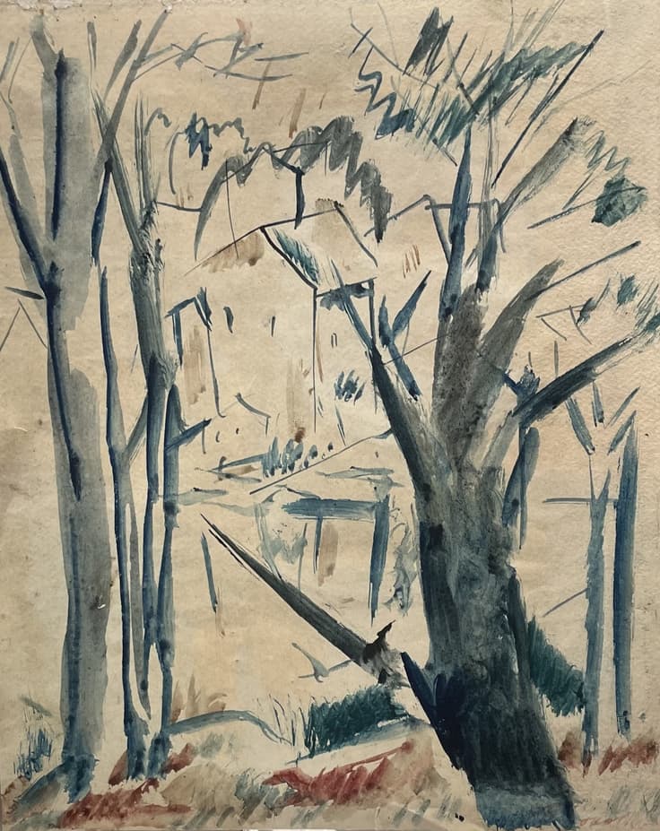Double-sided drawing: Cottage in a forest and Still life with glass
