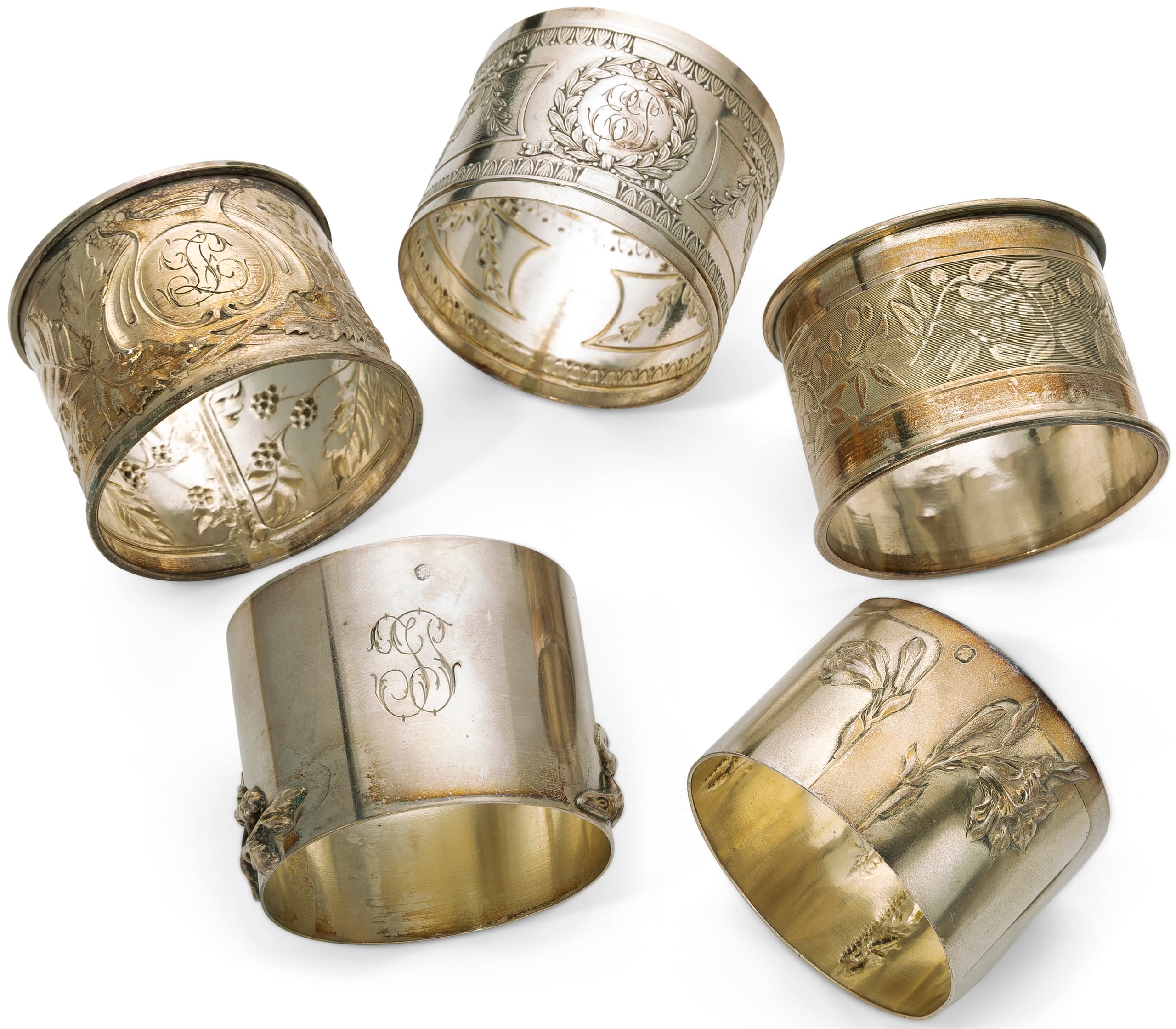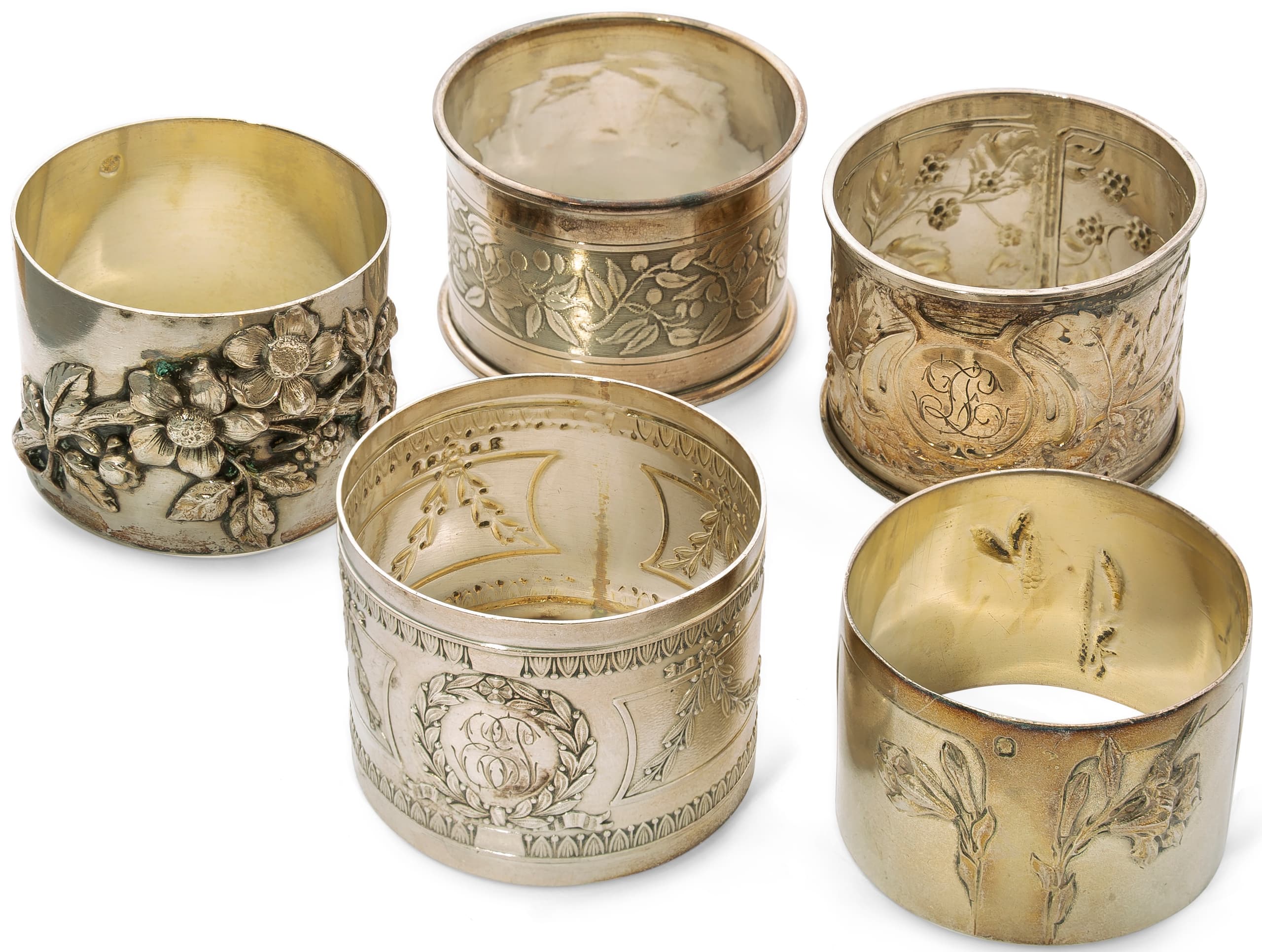 SET OF FIVE FRENCH SILVER NAPKINS RINGS late 19th- early 20th century