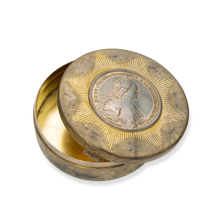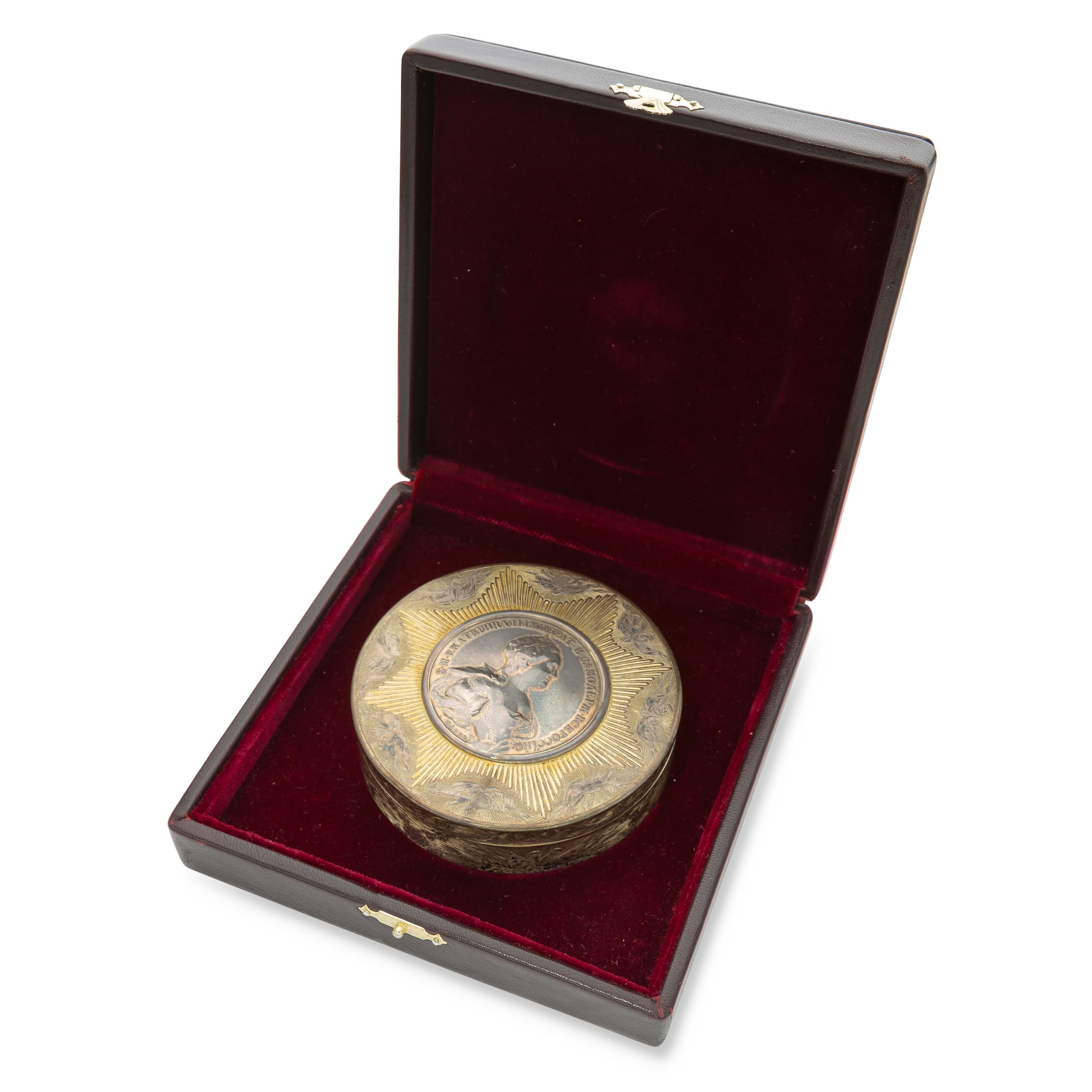 RUSSIAN PARCEL-GILT SIVER SNUFFBOX WITH A MEDALLION PORTRAIT OF CATHERINE II DEDICATED TO PEACE TREATY WITH TURKEY, JULY 10, 1774 S Yudin, Moscow, 1774