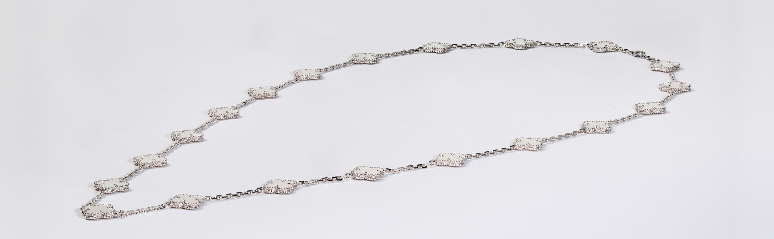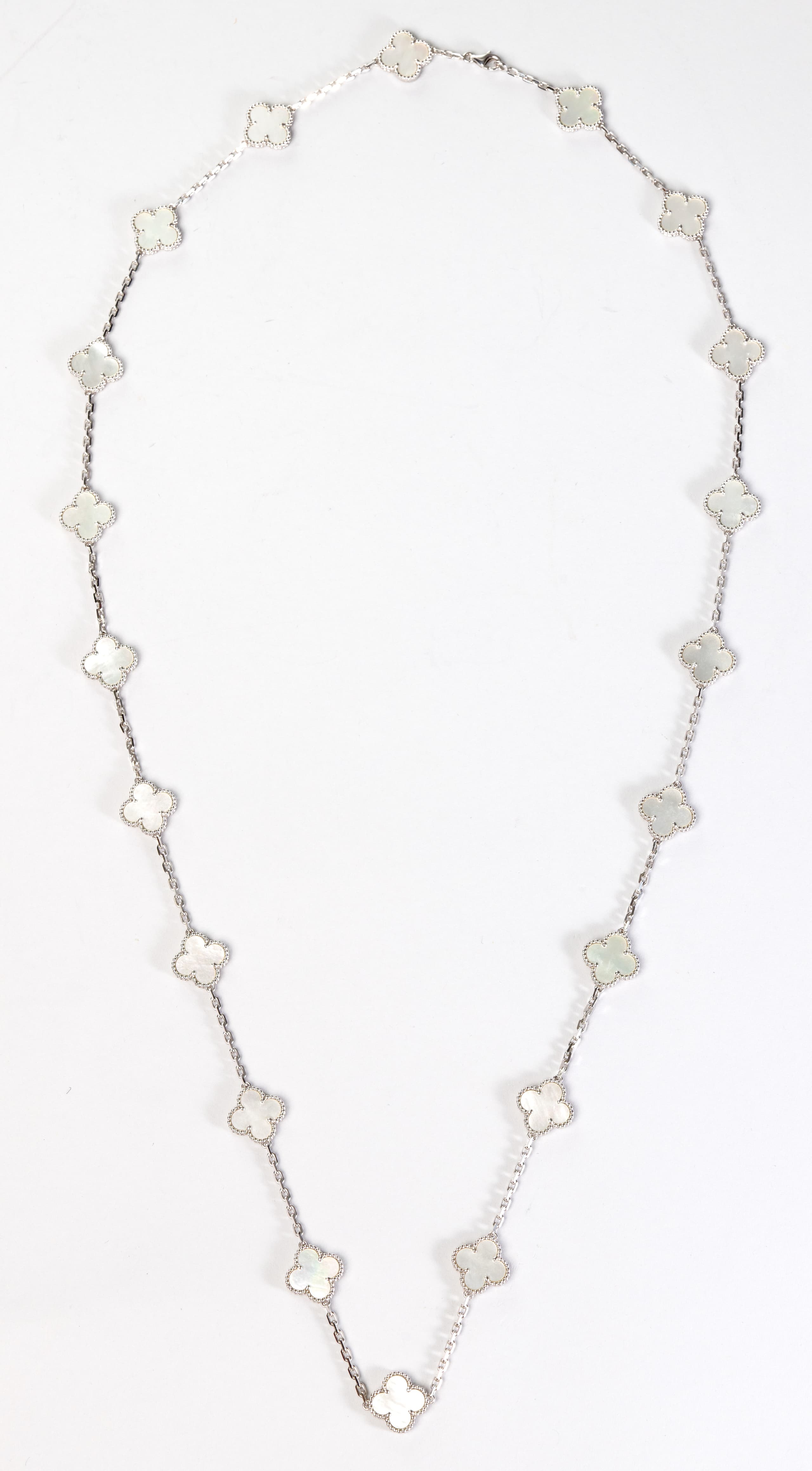 Van Cleef & Arpels necklace ‘Vintage Alhambra’ made in 18k white gold holding 20 clover-leaf patterns set with white mother-of-pearl