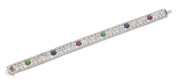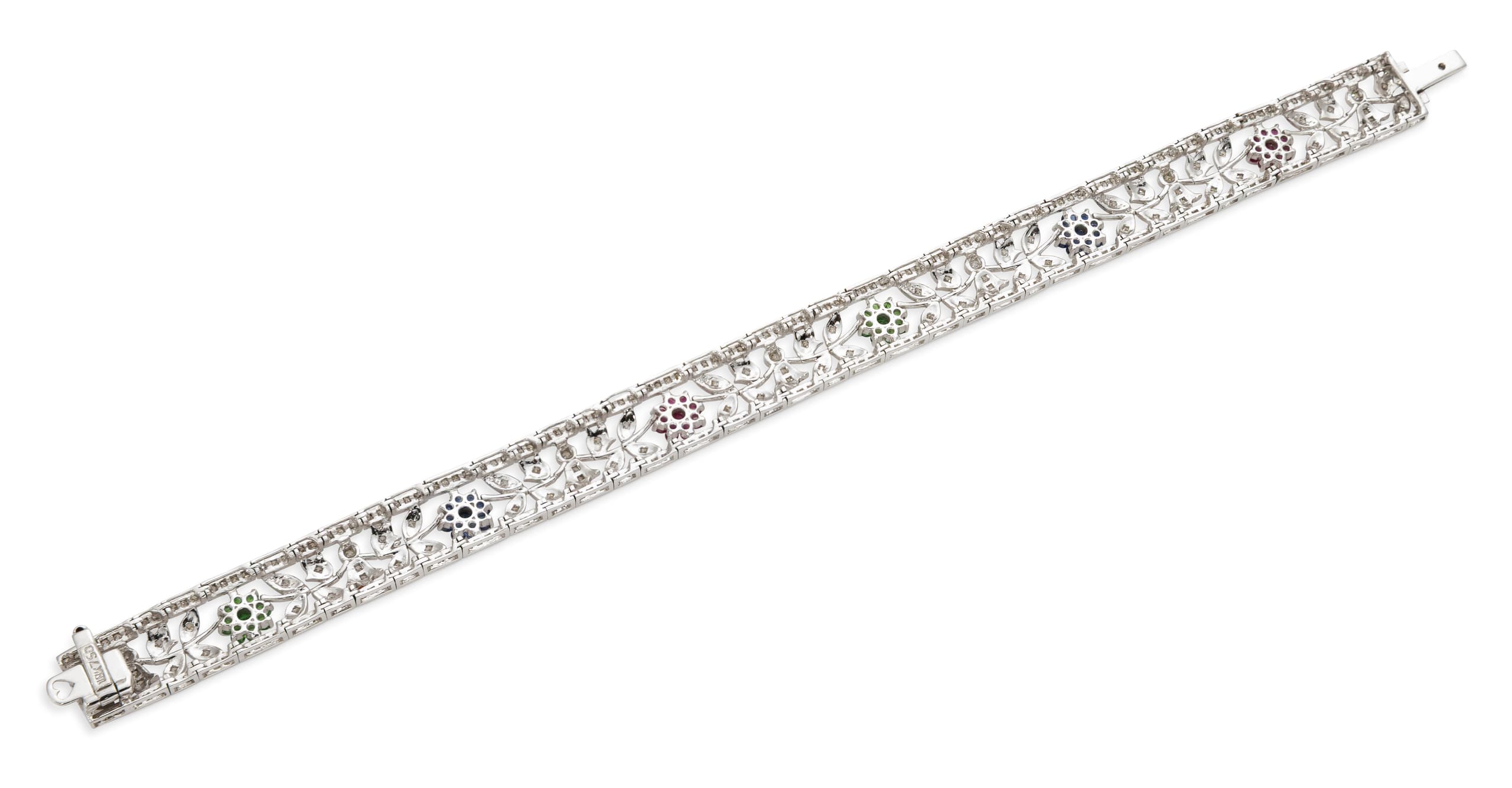 bracelet in 18k white gold set with brilliant-cut diamonds weighing approximately 1,00 ct. and ponctuated with flowers patterns made with rubies weighing approximately 0,35 ct., emeralds weighing approximately 0,35 ct. and sapphires weighing approximately 0,40 ct.