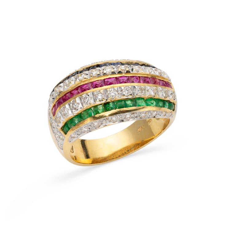 ring made in 18k yellow gold paved with brilliant-cut diamonds weighing approximately 0,7 ct. enhanced with stripes of calibrated rubies weighing approximately 0,25 ct., calibrated sapphires weighing approximately 0,20 ct. and calibrated emerald weighing approximately 0,20 ct.