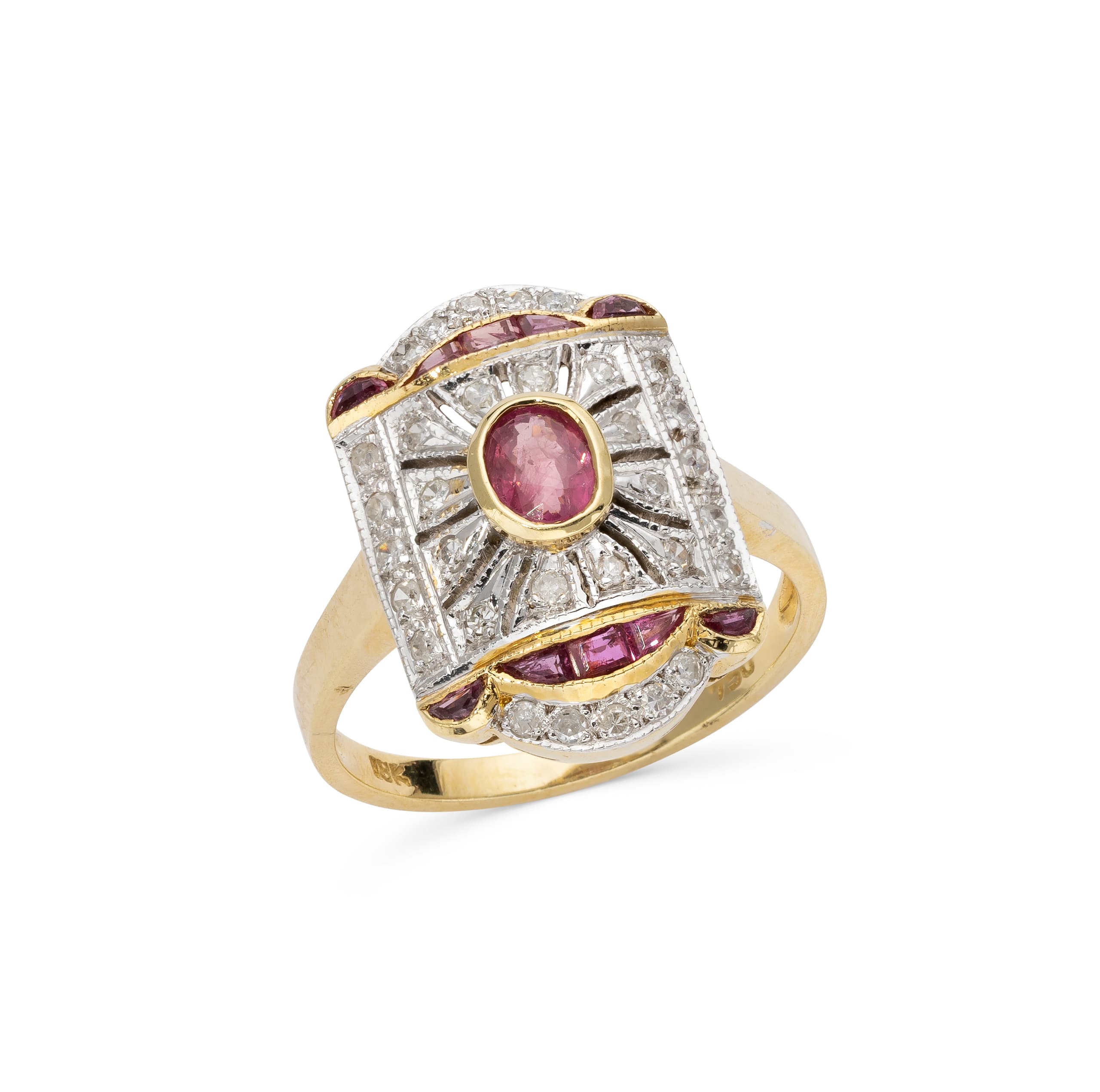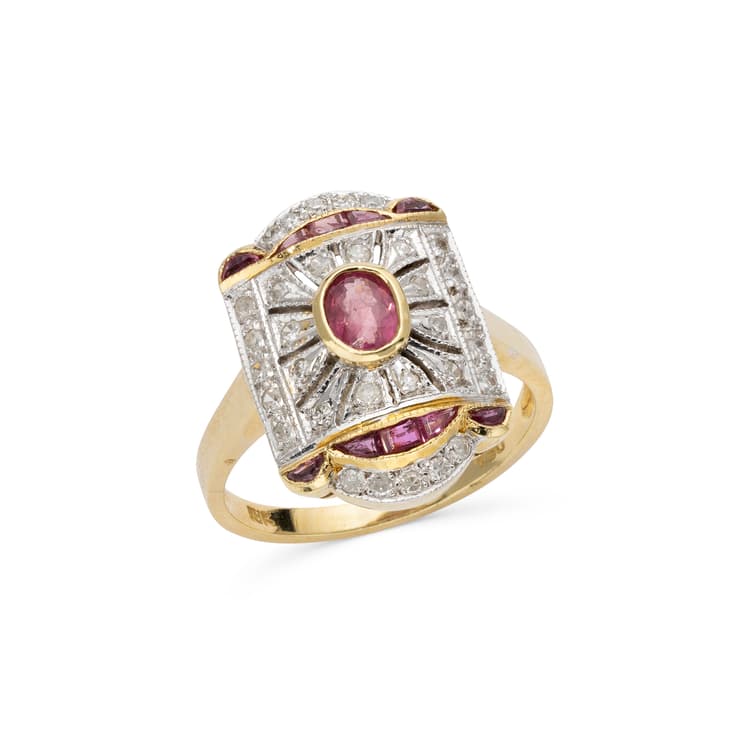 ring in 18k yellow gold paved with old-cut diamonds weighing approximately 0,25 ct. And calibrated rubies weighing approximately 0,15 ct. and set with an oval ruby weighing approximately 0,15 ct.