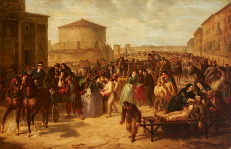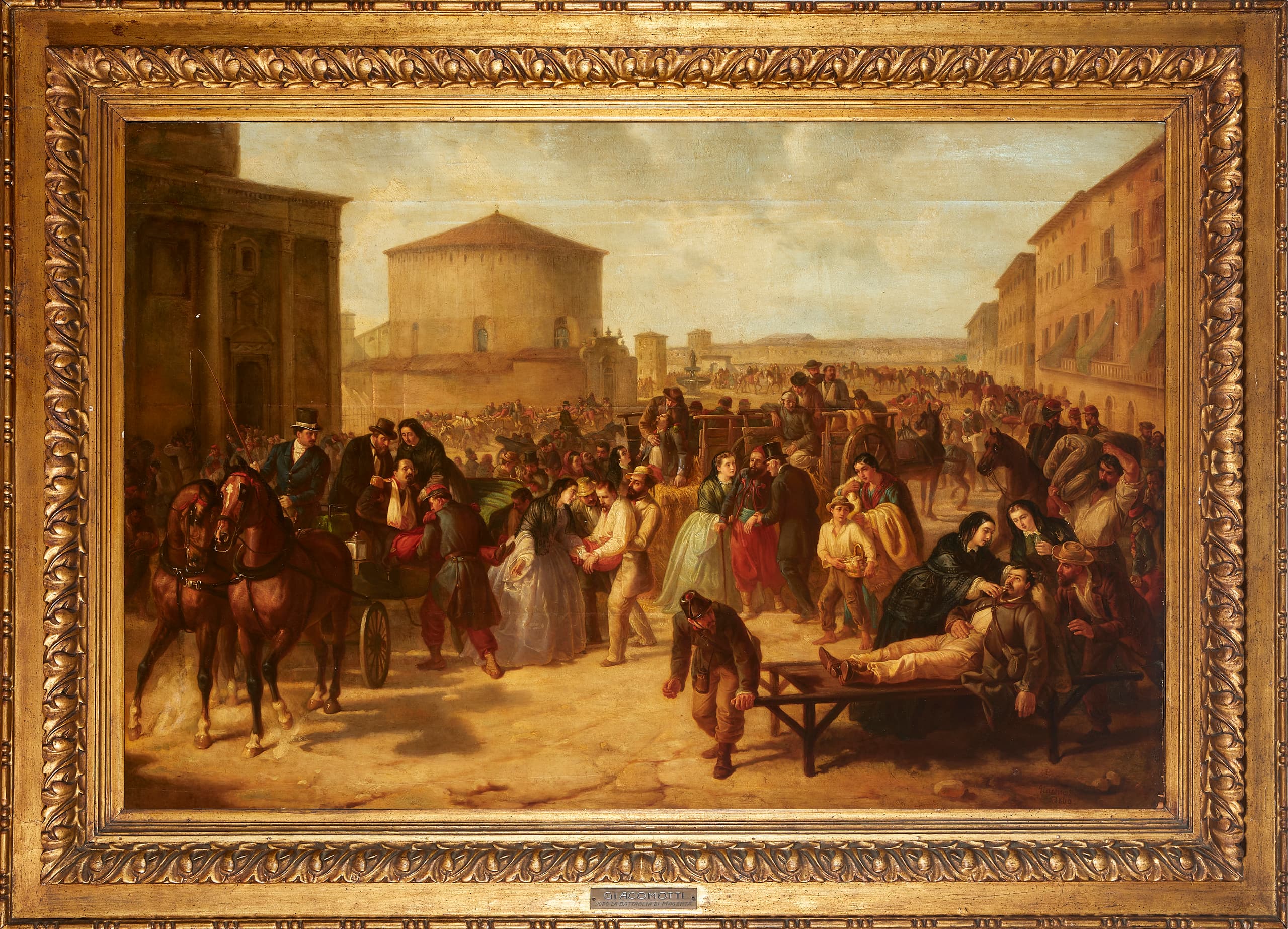 Félix-Henri Giacomotti (1828-1909), of Italian origin, became a naturalised French citizen in 1849 and studied at the Besançon School of Drawing. In 1854 he won the Prix de Rome for historical painting for Abraham Washing the Angels’ Feet, and went to Rome to study at the Villa Medici. On his return, he exhibited at the Salon from 1859 to 1909. He received numerous commissions, including a ceiling for the Musée du Luxembourg, La Gloire de Rubens, now in Bourges town hall. He was appointed director of the municipal school of fine arts and curator of the Besançon museum until his death. Giacomotti had a penchant for religious and history painting, such as this scene after the Battle of Magenta, fought on 4 June 1859 during the Italian Campaign, which ended in a Franco-Sardinian victory led by Napoleon III against the Austrians of Marshal Ferencz Gyulai.