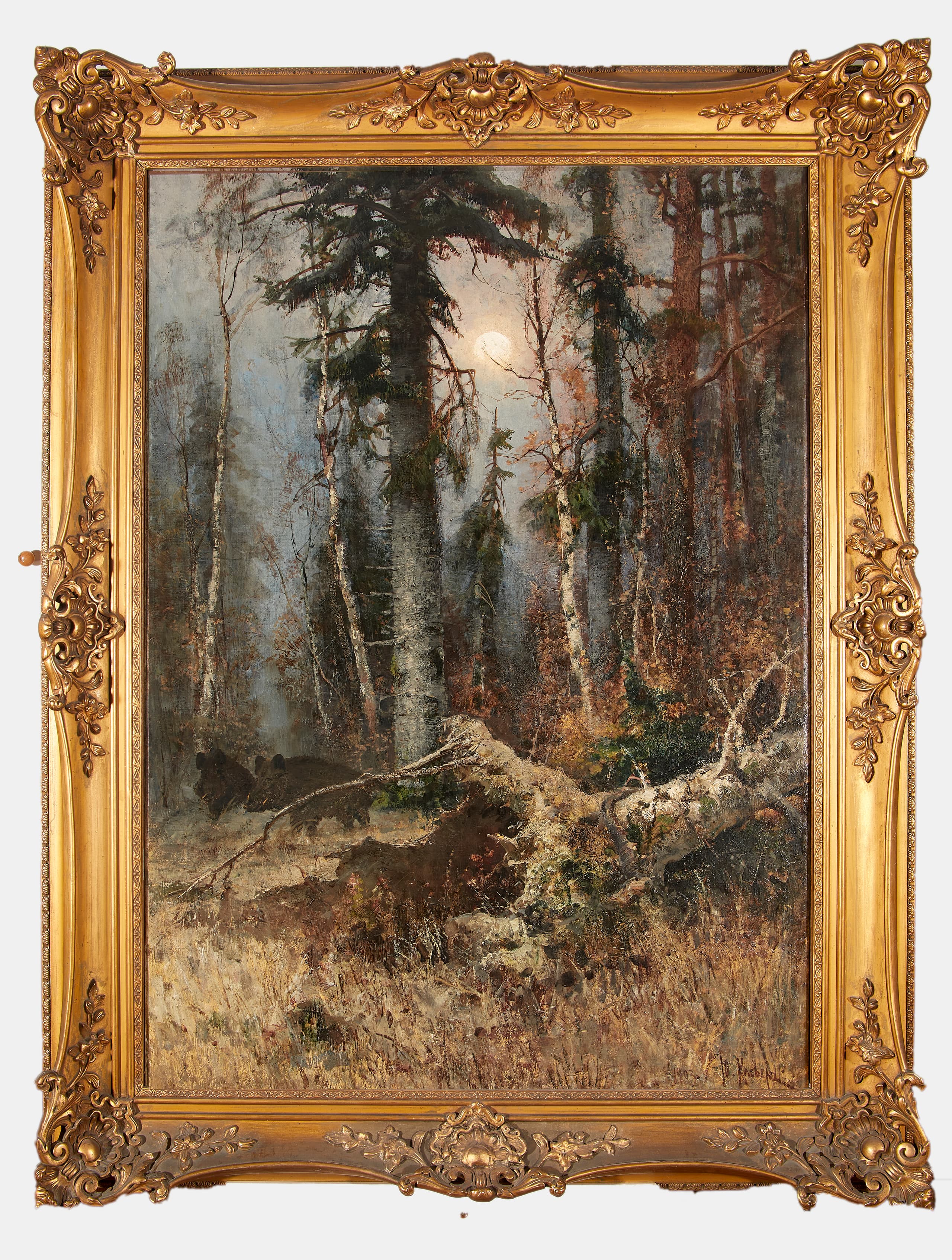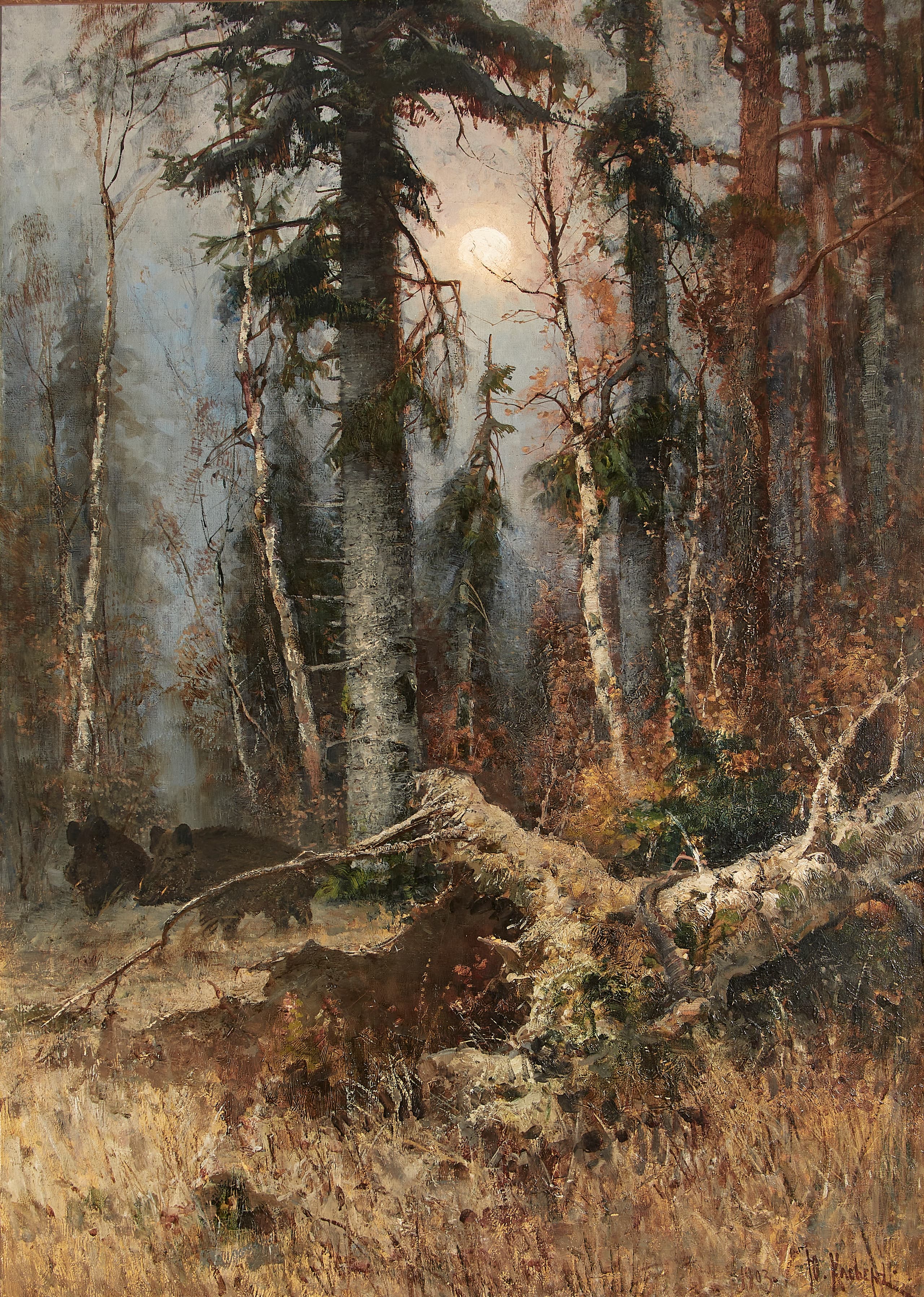 This atmospheric forest scene by Julius von Klever captures the haunting beauty of a late autumn landscape. Under the pale light of a full moon the forest takes on a mysterious presence. Tall spruces, rendered with Klever’s characteristic precision, dominate the composition; their silhouettes rise against the night sky, with a fallen tree in the foreground. The ground is carpeted ochre grass with fallen leaves, the last remnants of the fading season. At right, two wild boars make their way through the underbrush — likely added at a later stage, a familiar practice in Klever’s work — subtly animating the stillness of the scene and adding a narrative dimension.