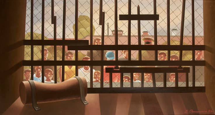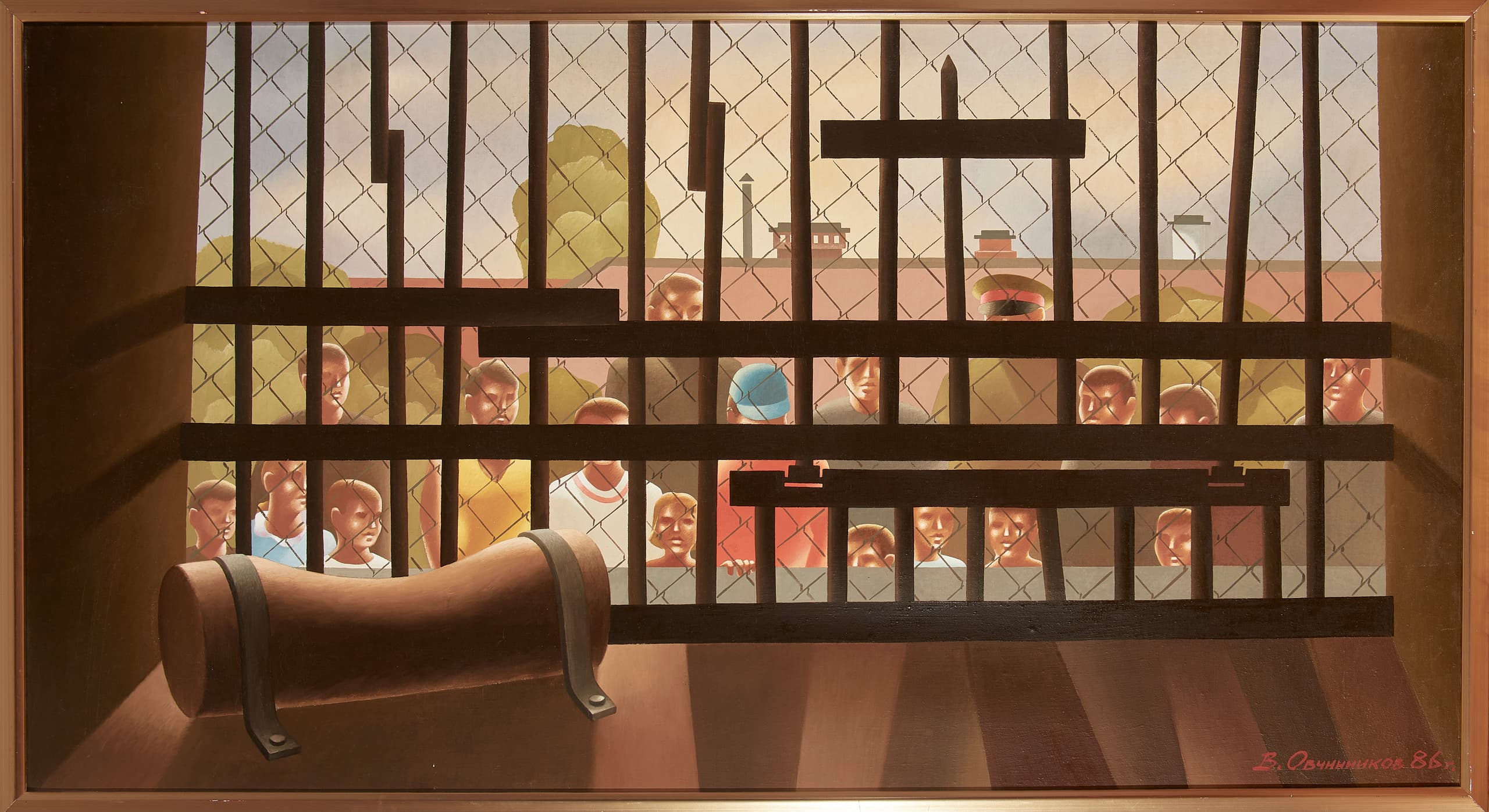 Vladimir Ovchinnikov’s Leningrad Zoo (1986) is a defining artwork for the artist, as it is one of the few subjects to which he returned several times throughout his life. Ovchinnikov recalled this composition as being particularly meaningful to him — a meditation on observation, confinement, and the reversal of roles between subject and viewer.