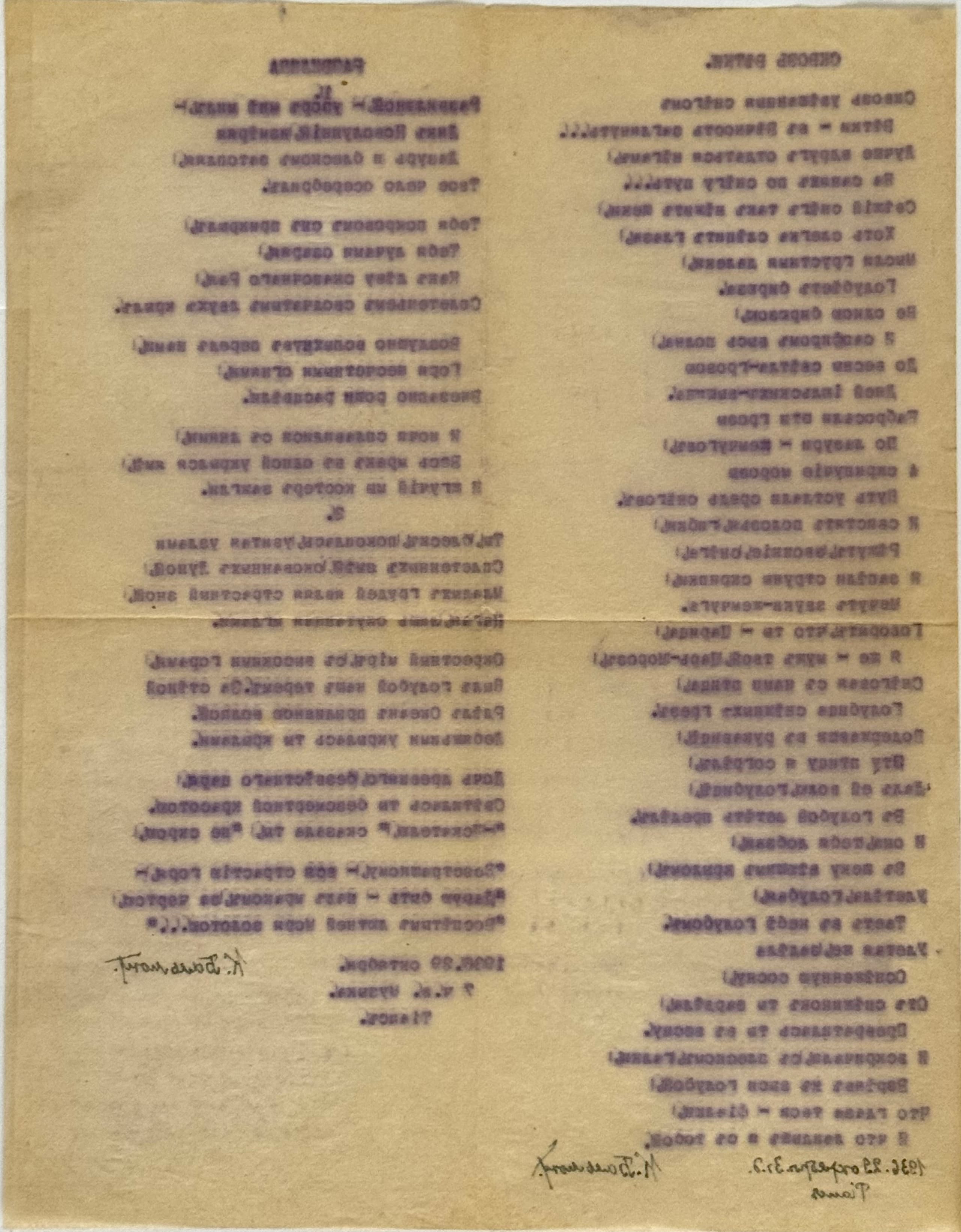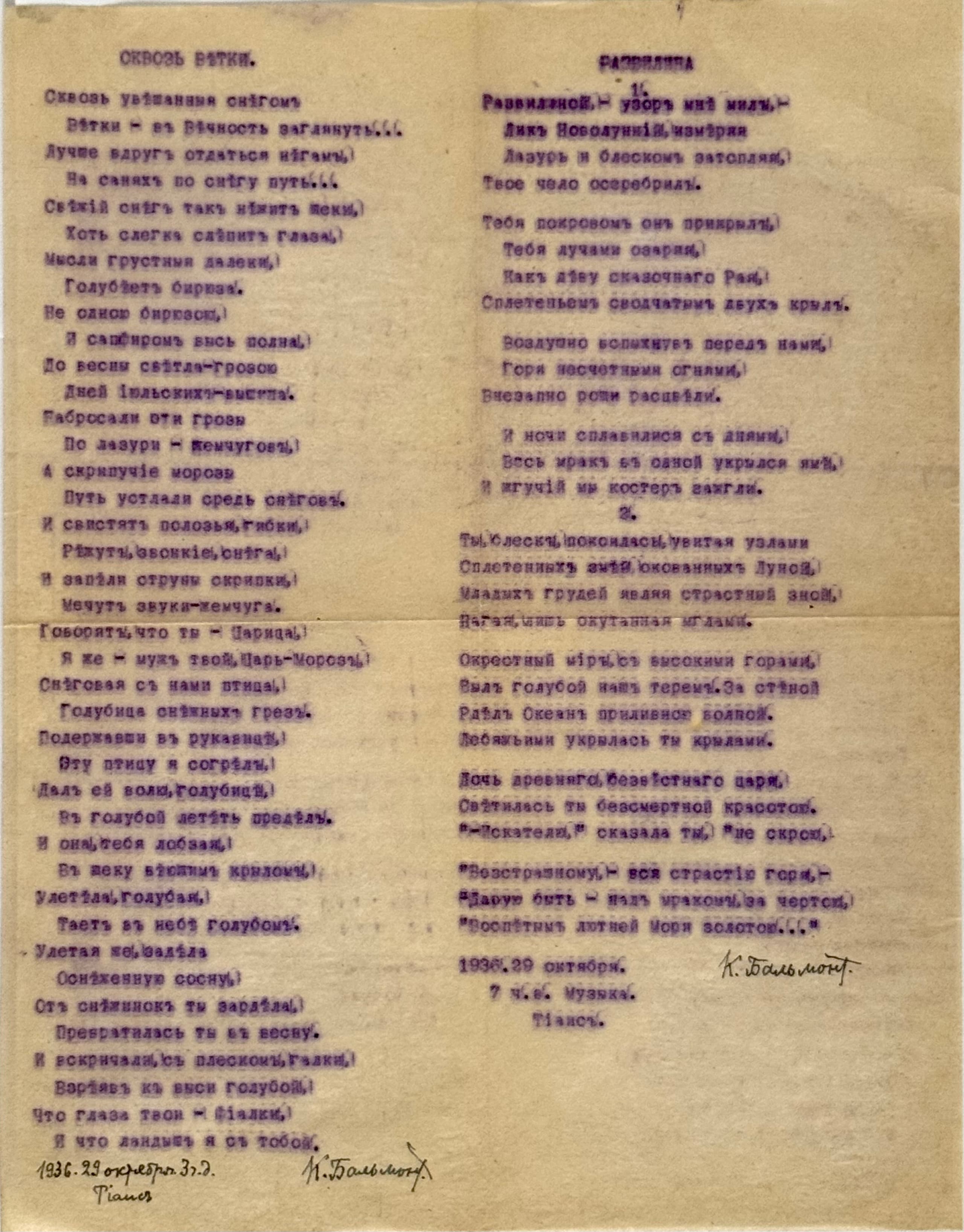 БАЛЬМОНТ Константин Дмитриевич (1867-1942) Два стихотворения 'Сквозь ветки' и 'Развилина'. Тиаис. 29 октября 1936 г.