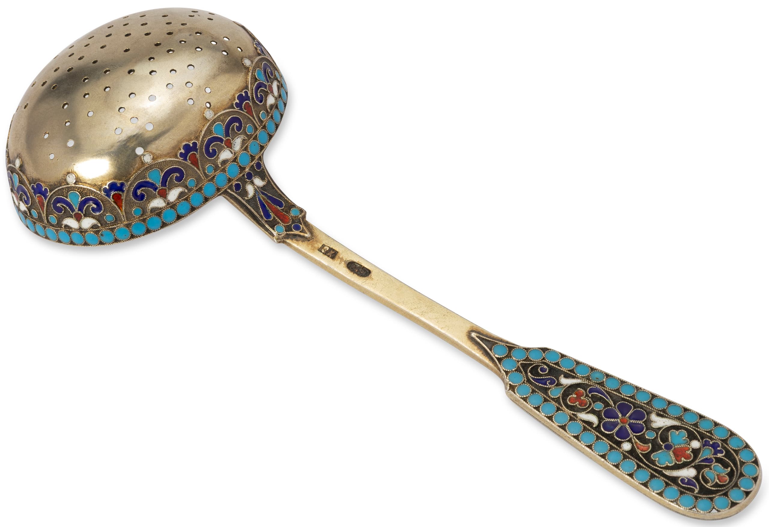 RUSSIAN SILVER AND ENAMEL TEA STRAINER