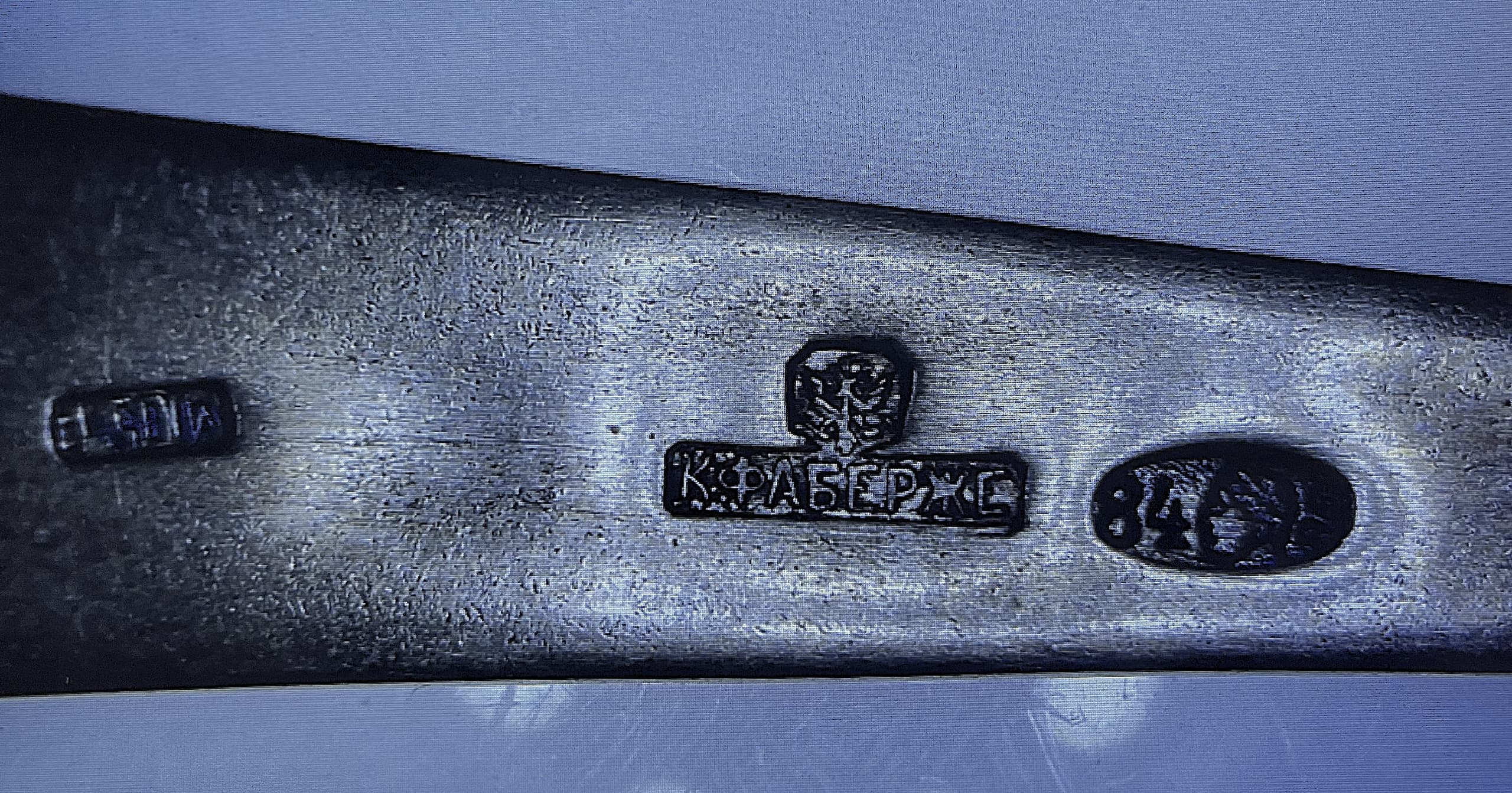 Hallmarks: ‘84’ silver standard, woman’s head in kokoshnik facing left, mark in Cyrillic ‘K FABERGE’ under the double-headed eagle, worker’s head ‘875’