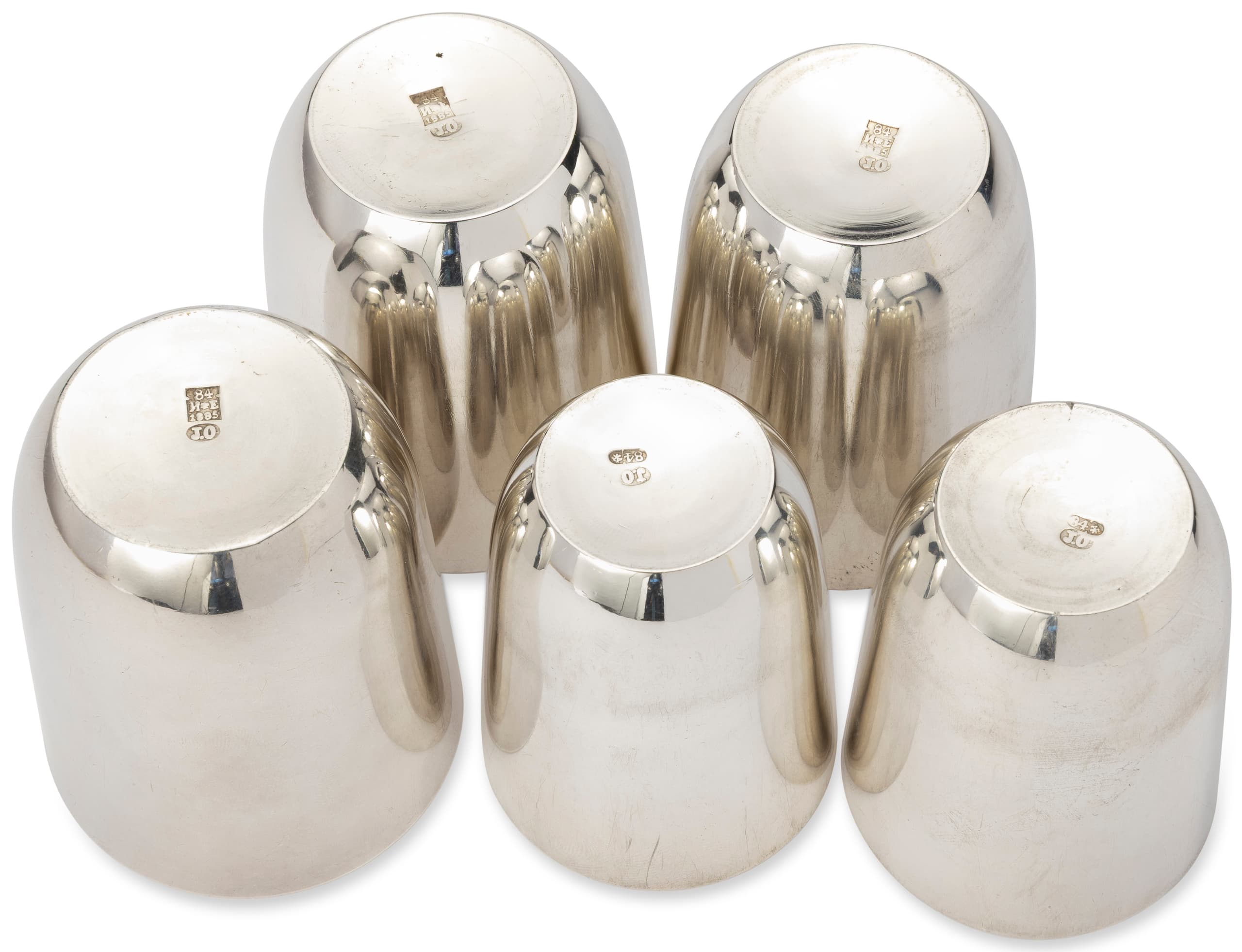 FIVE RUSSIAN TRAVEL STACKING SILVER BEAKERS / VODKA SHOT BEAKERS