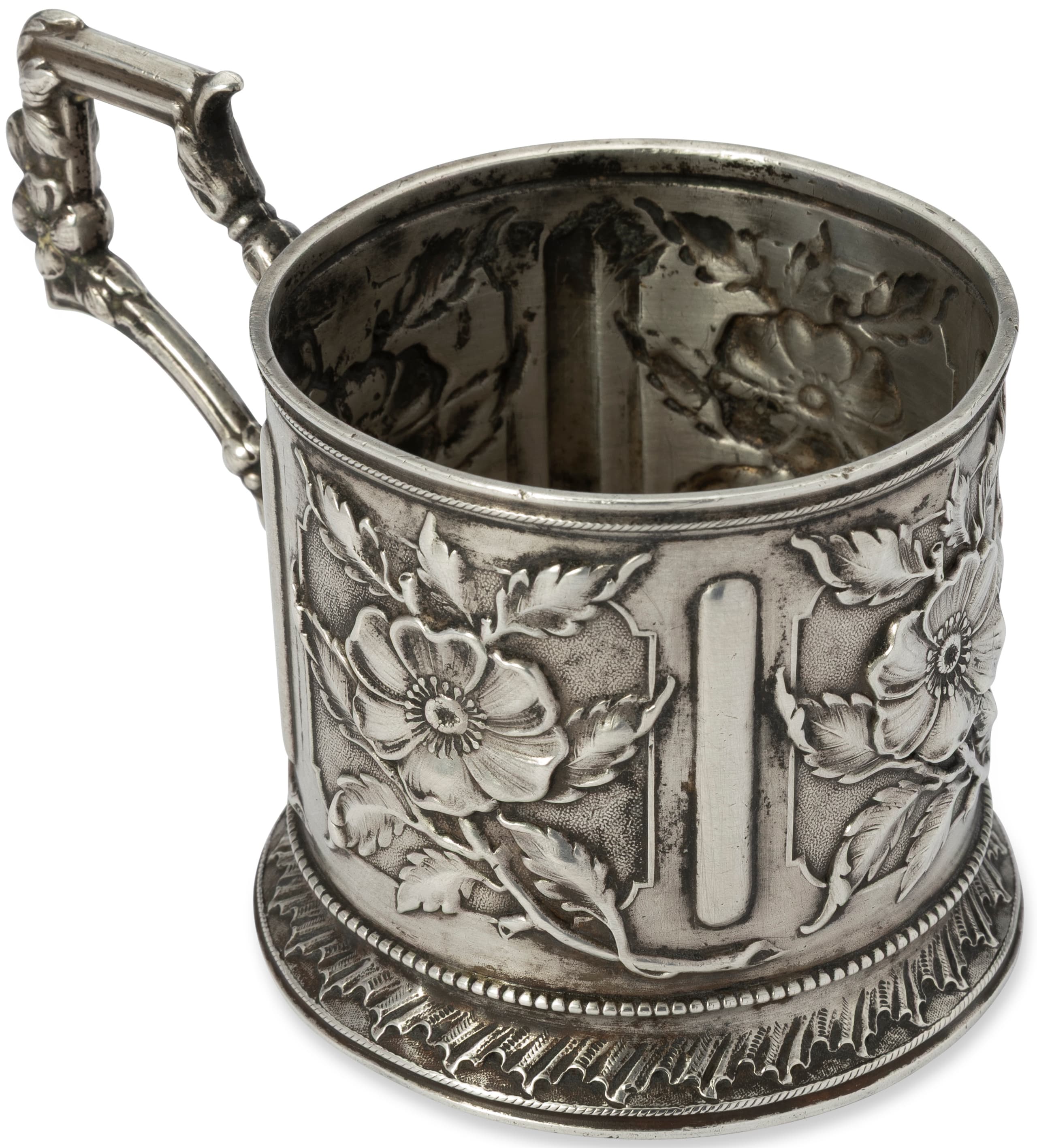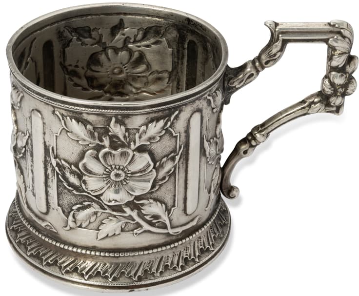 RUSSIAN SILVER GLASS HOLDER WITH EMBOSSED AND CHASED FLOWERS