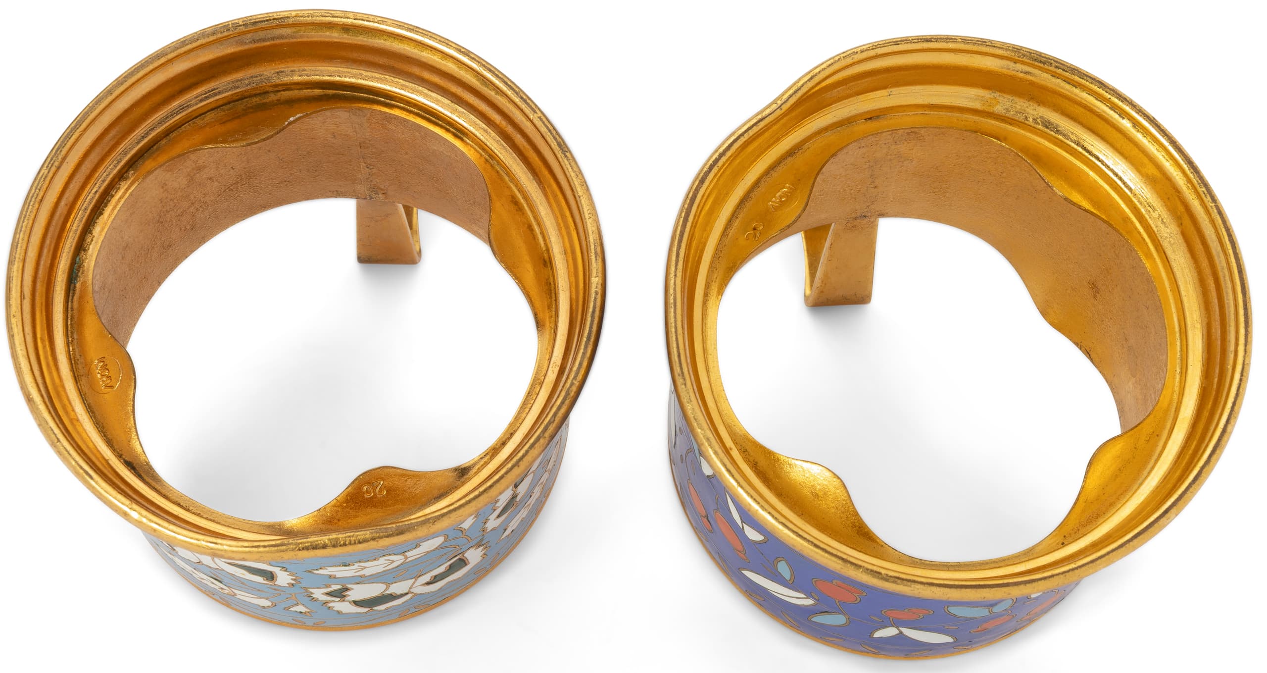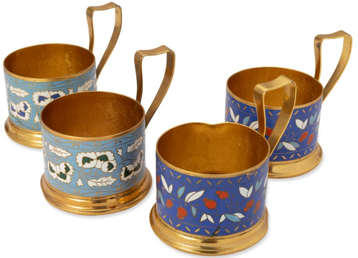 FOUR SOVIET METAL AND ENAMEL TEA GLASS HOLDERS ‘WALNUT’ AND ‘ROWANBERRY’, circa 1970s