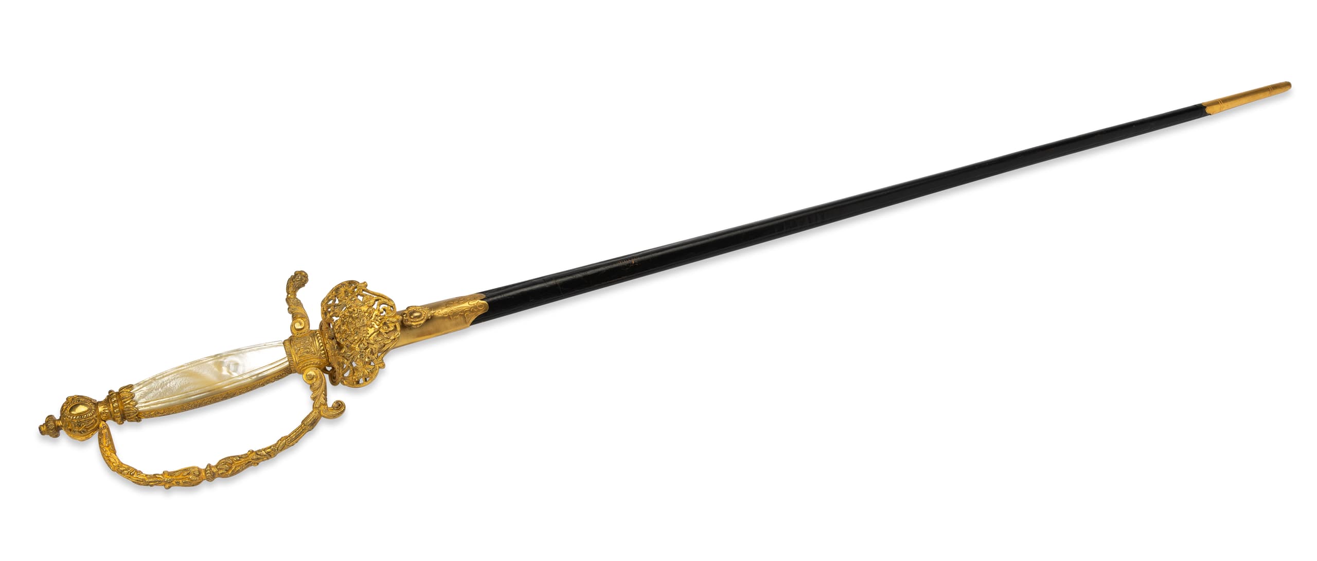 gilt pommel in the shape of an imperial crown, openwork guard with imperial arms, mother-of-pearl handle, blade with engraved decoration, scabbard with gilt finishes