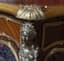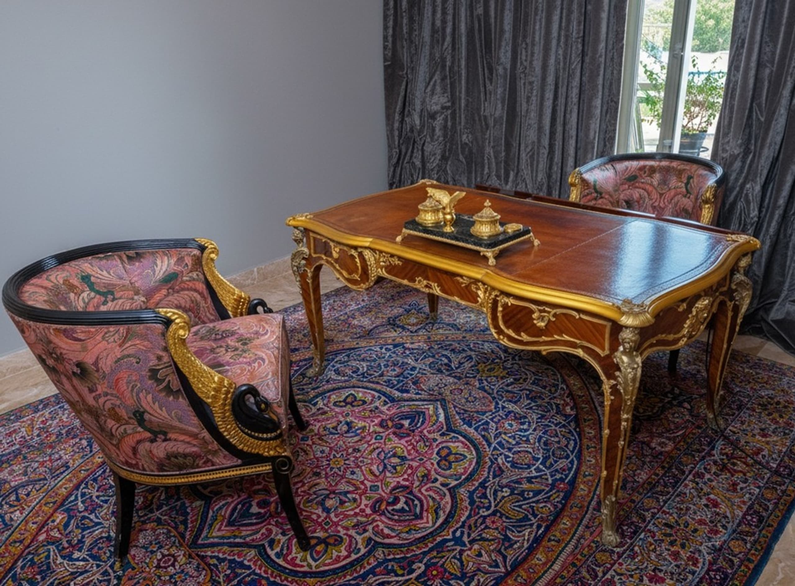 richly decorated with gilded bronze mascarons, espagnolettes, astragal and feet, leather top