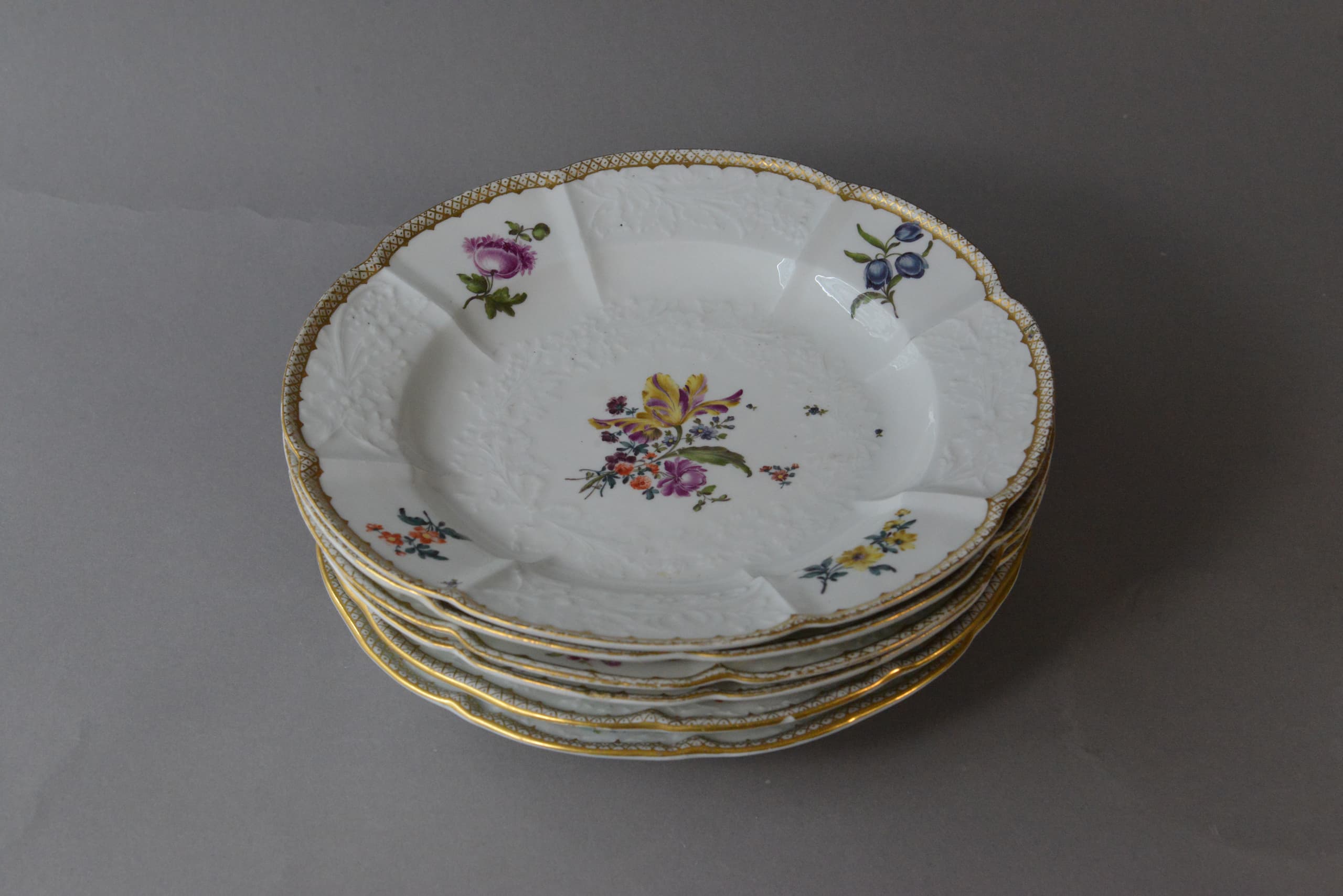 SIX MEISSEN PORCELAIN PLATES WITH GOTZKOWSKY RELIEF DECORATION, CIRCA 1745–1750
