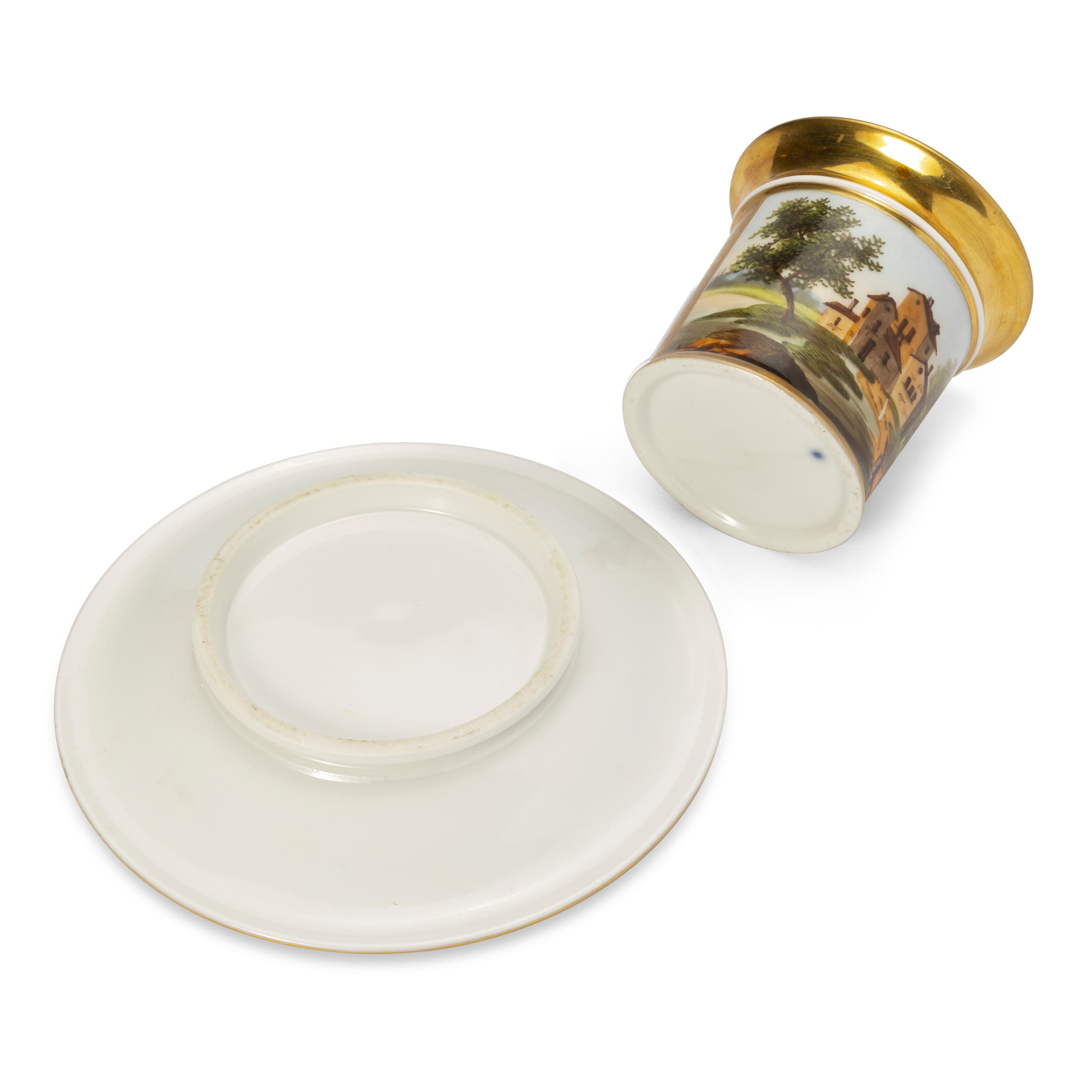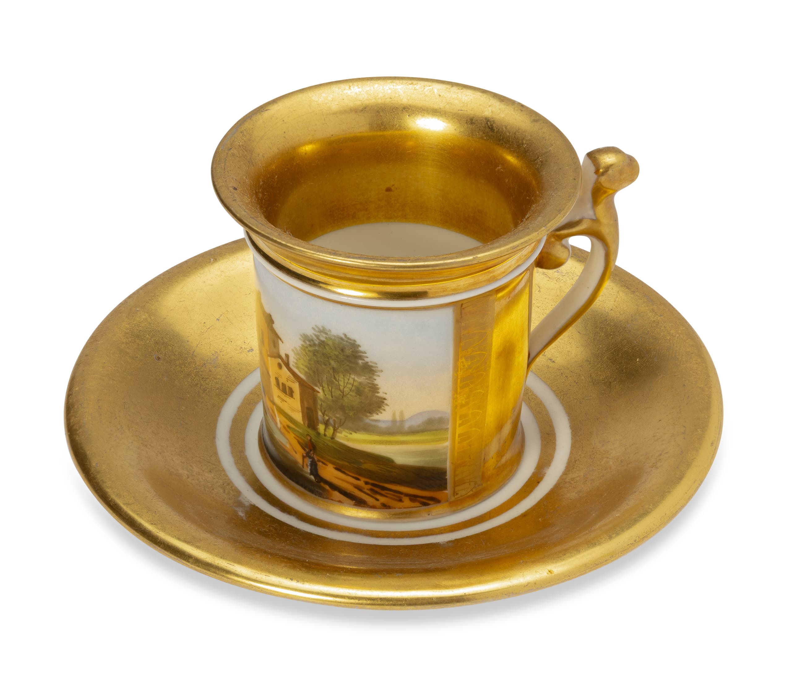 EUROPEAN PORCELAIN CUP DECORATED WITH LANDSCAPE AND SAUCER