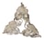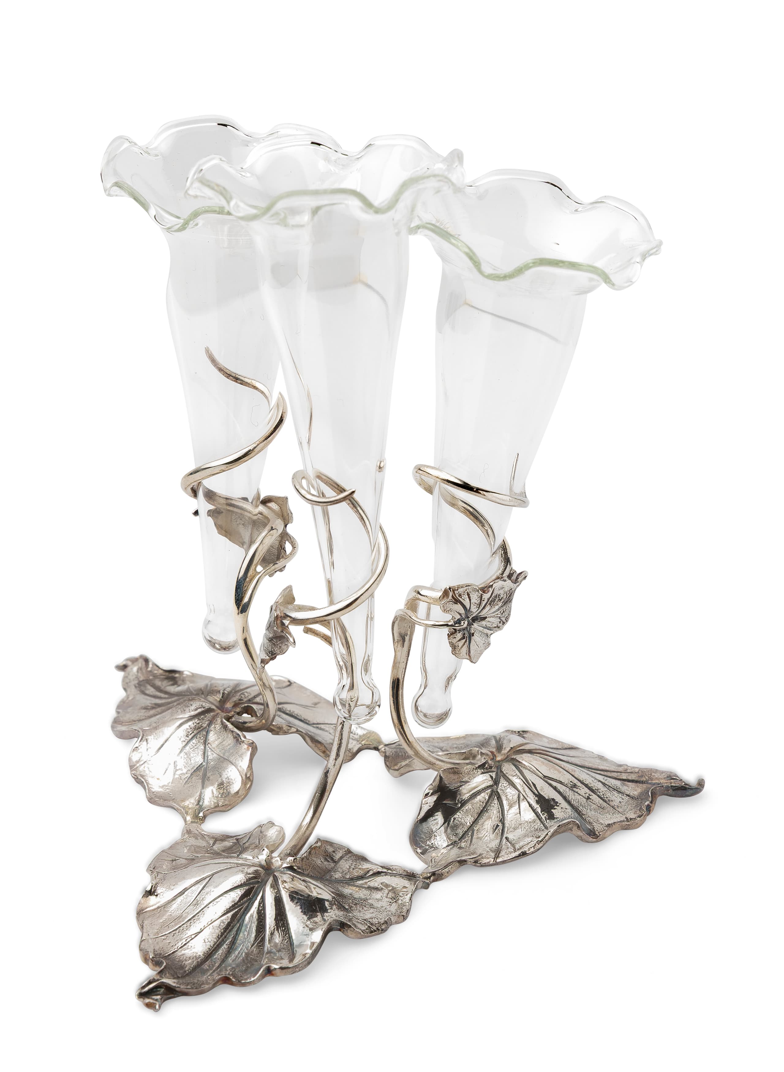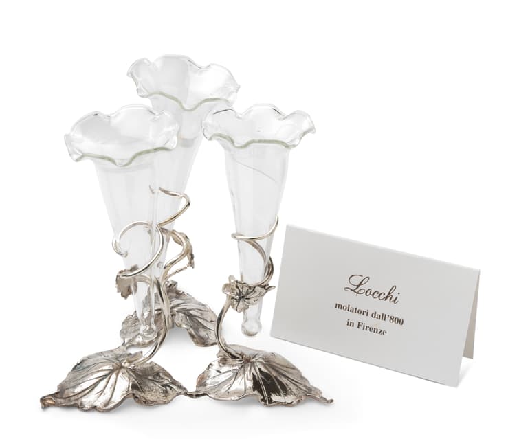 three small tulip-shaped crystal vases for single flower supported by sterling silver leaves