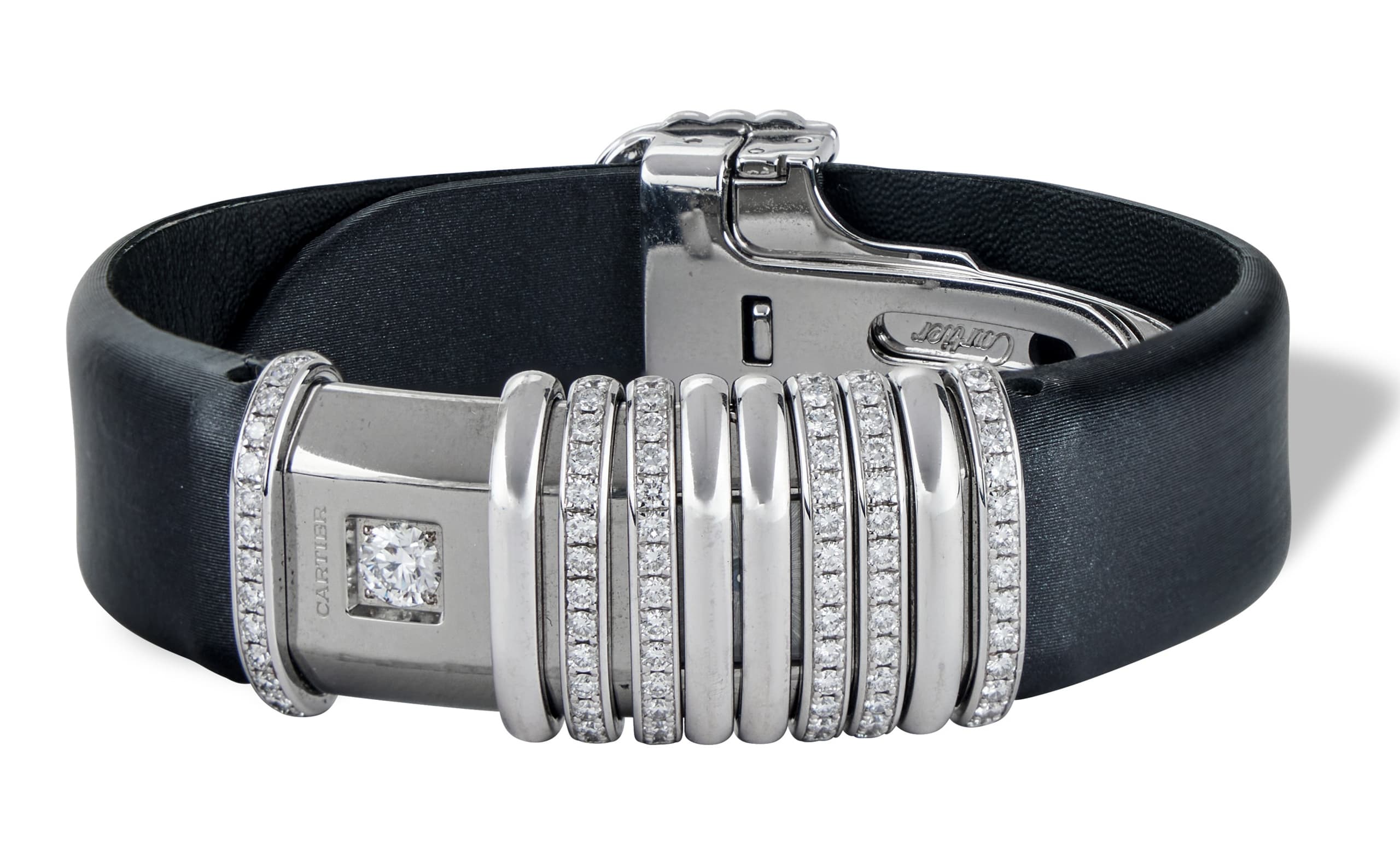 Strap: black satin with 18k white gold folding clasp set with diamonds