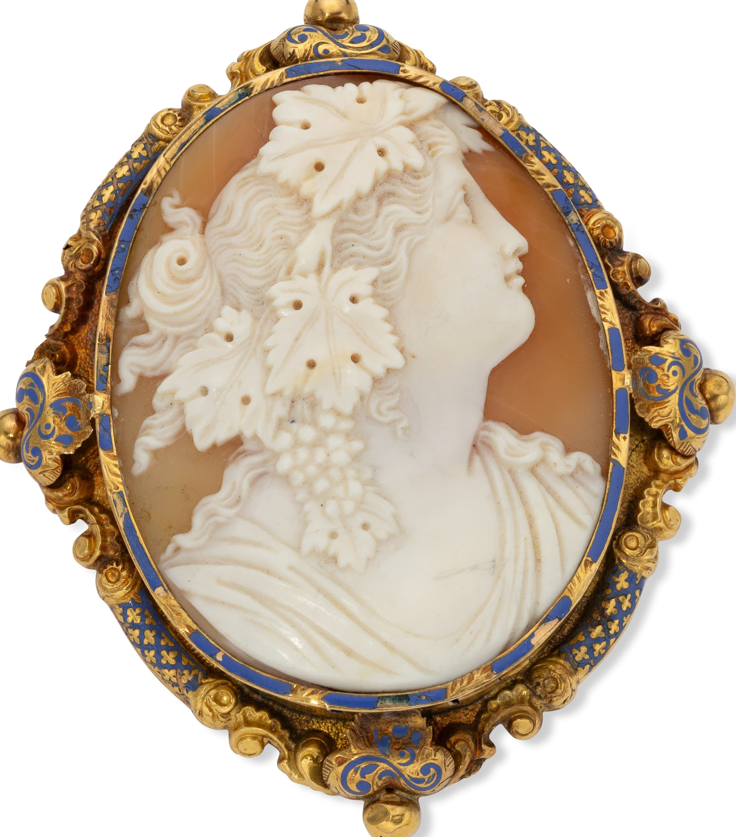 Vintage gold and blue enamel brooch decorated with a shell cameo respresenting the bust of a woman with bunches of grapes. 6.2 x 5.5 cm gross weight: 18.82 gr. Condition: overall good condition, some restorations with tin soldering, not original pin, small chim on enamel