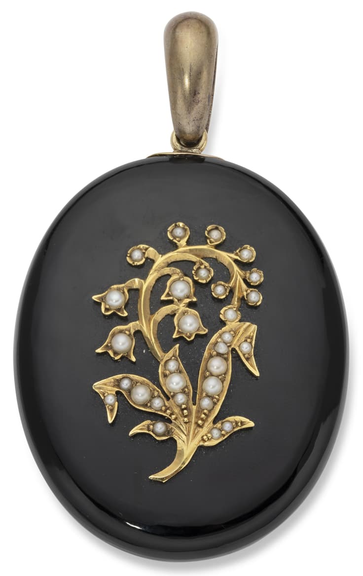 black onyx and silver-gilt medallion decorated with silver-gilt and pearl lily of the valley flowers H. 4.5 cm gross weight: 23.91 gr.