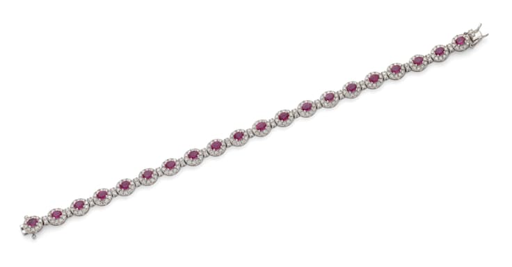18k white gold bracelet set with 240 round cut diamonds weighing approximately 2.85 ct. and 20 rubies weighing approximately 3.90 ct. Hallmark: 'K18', '750', 'D2.85', 'R3.90' L. 19 cm gross weight: 14.22 gr.