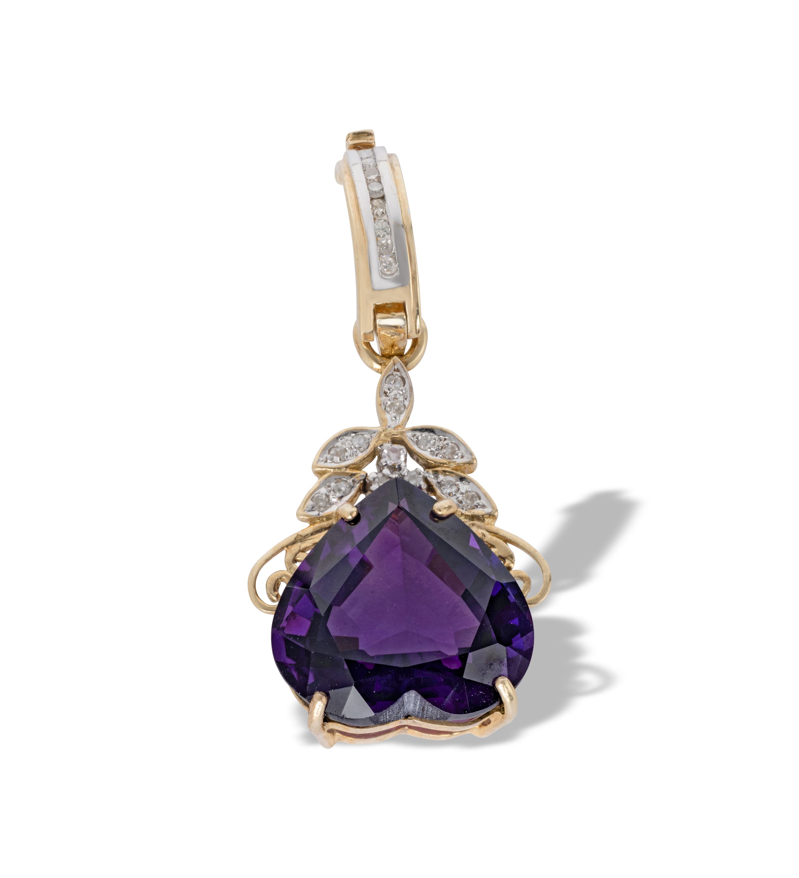 Pendant 14k yellow gold set with amethyst (circa 8 ct.) and diamonds (circa 0.15 ct.), removable bélière