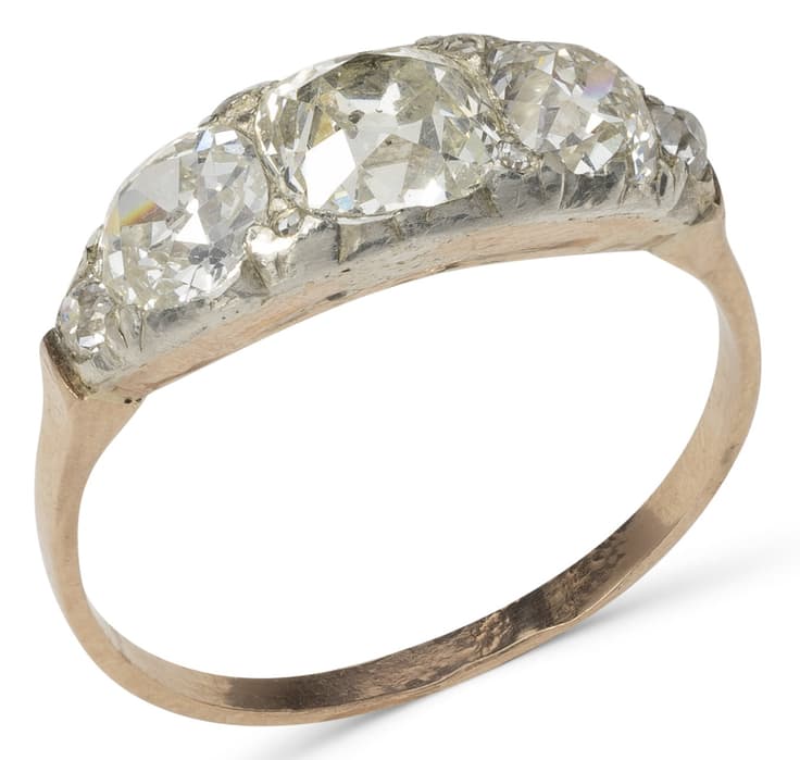 19th - early 20th century 14k yellow gold ‘Jarretière’ ring set with old-cut diamonds, center diamond weighing approximately 2.00 ct. surrounded with two diamonds weighing approximately 1.00 ct. each, in total weighing approximately 4 ct.