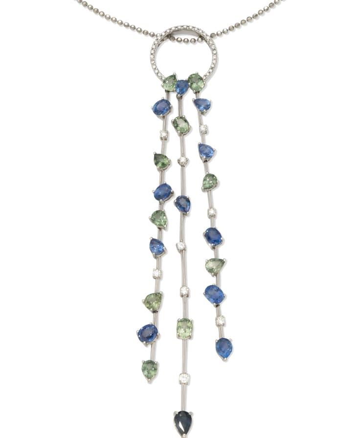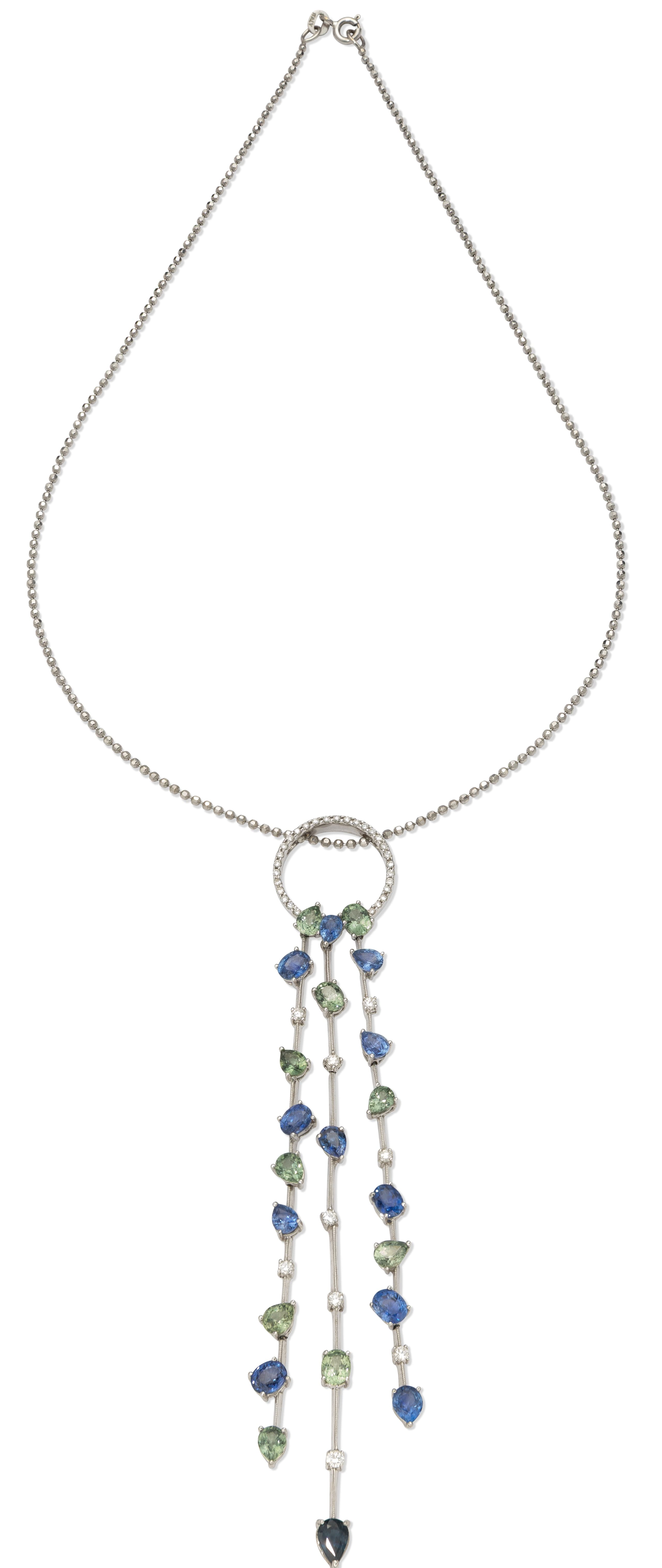 18k white gold chain set with diamonds weighing approximately 0.50 ct. and 18k white gold pendant set with blue and green oval and pear-cur sapphires weighing in total approximately 9.00 ct.