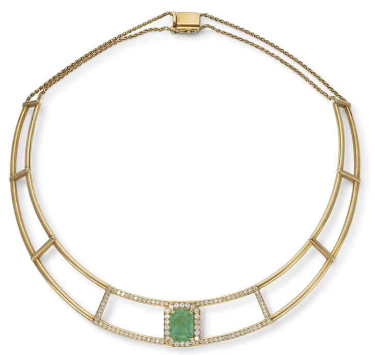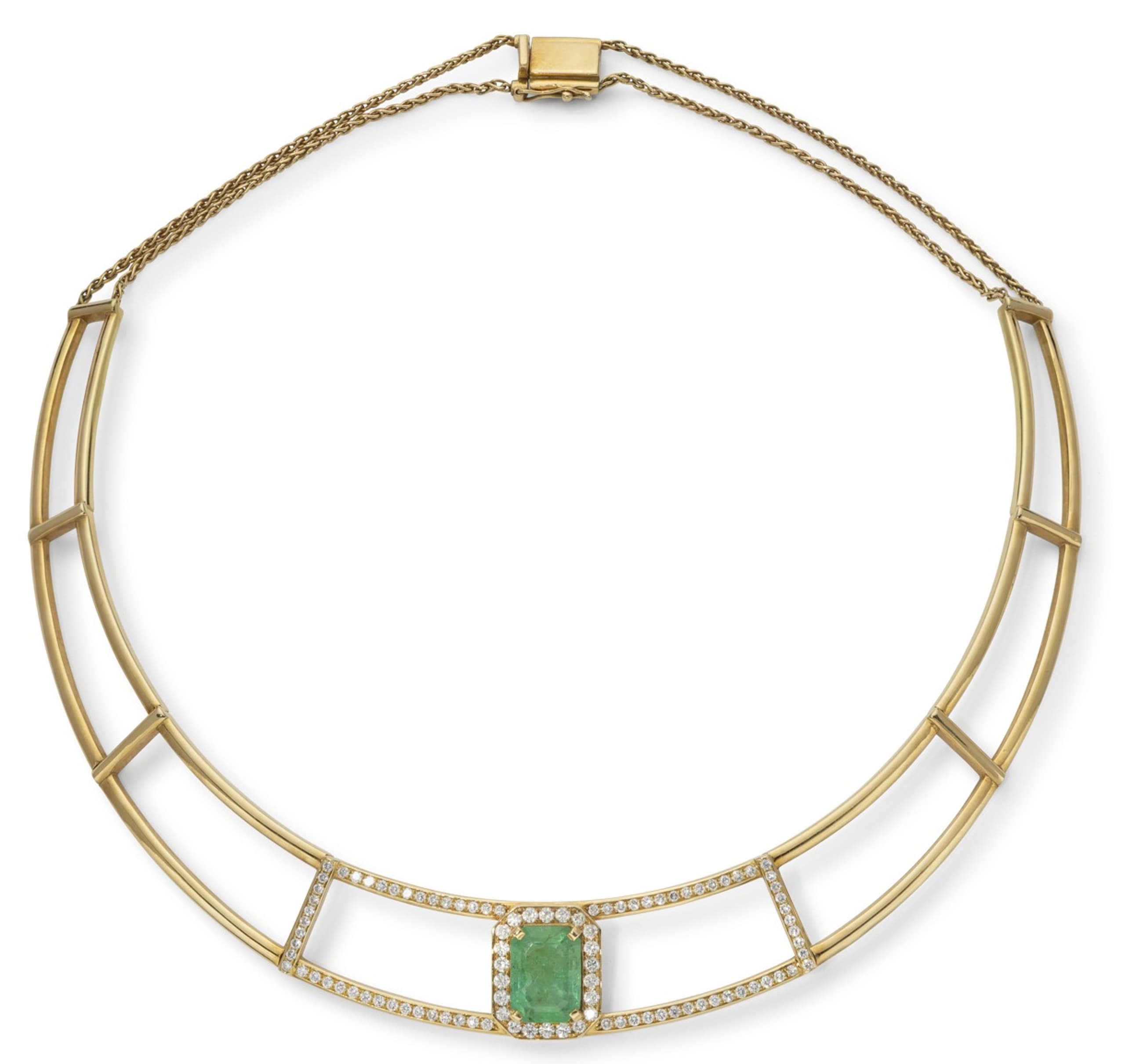 18k yellow gold semi-rigid necklace set with diamonds weighing approximately 2.20 ct. and emerald weighing approximately 5.55 ct.