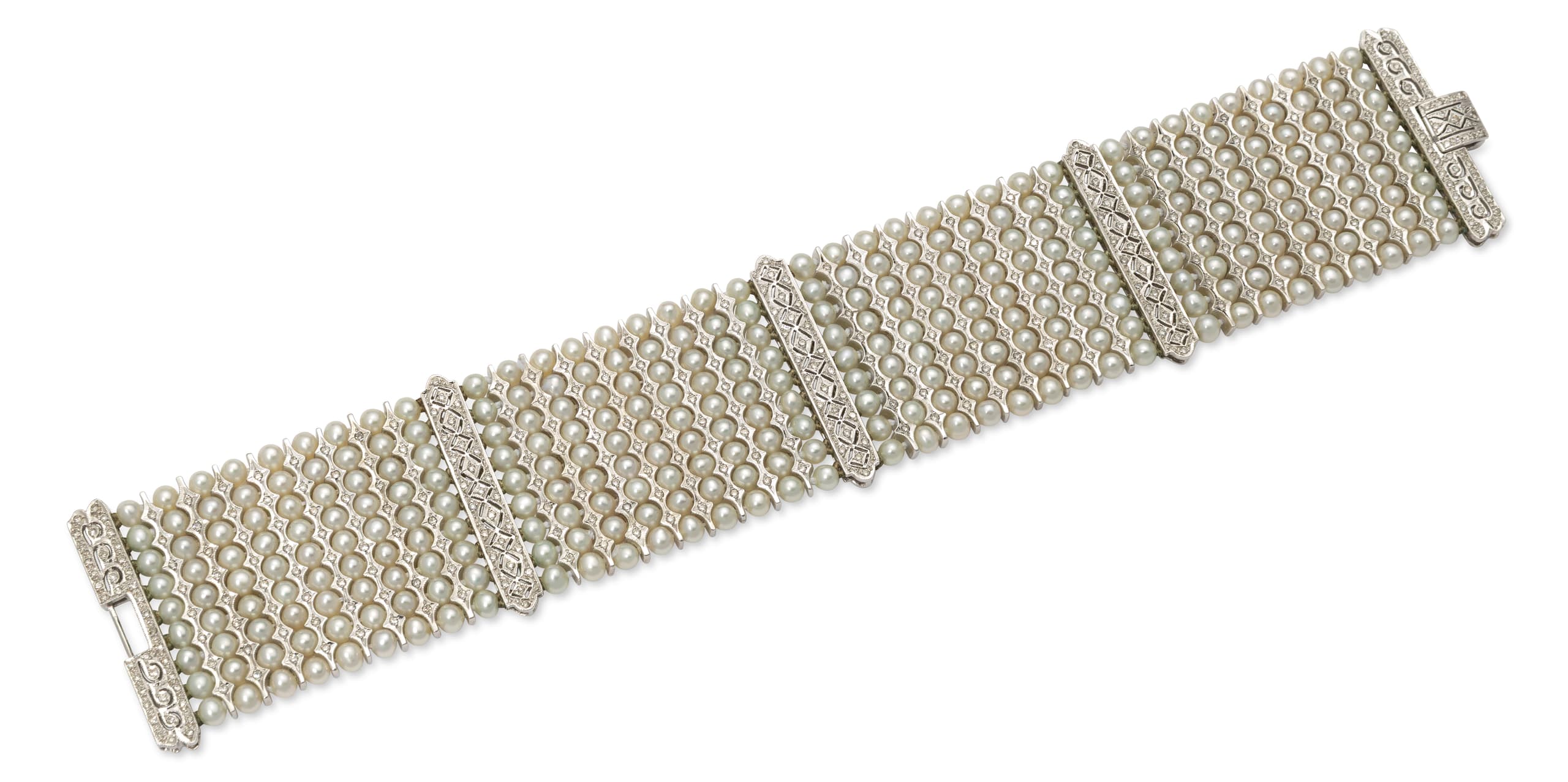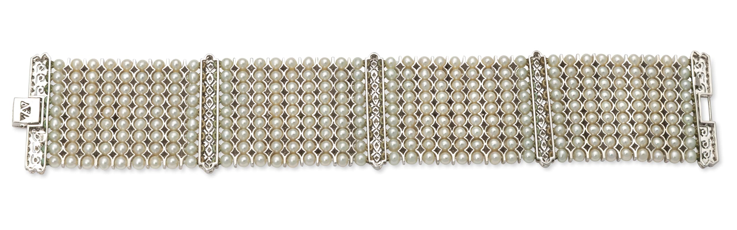 14k white gold bracelet set with freshwater pearls and brilliant-cut diamonds weighing approximately 2.00 ct.