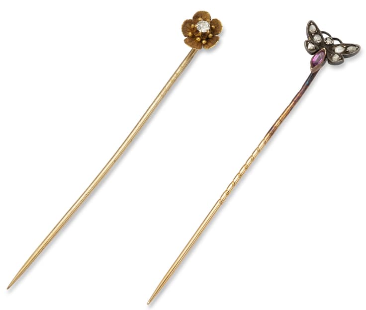 including a flower-shaped pin with a diamond in the centre and a butterfly-shaped pin set with rose-cut diamonds and a pink stone total gross weight: 3.47 gr.
