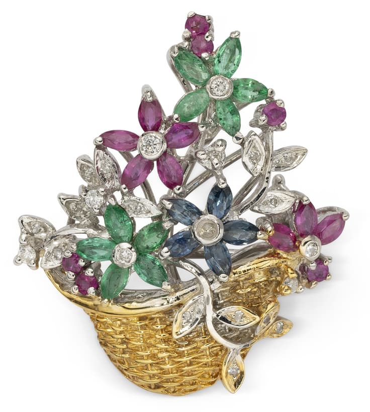 14k white and yellow gold flower basket-shaped brooch set with diamonds, emeralds, rubies and sapphires