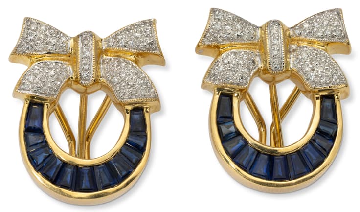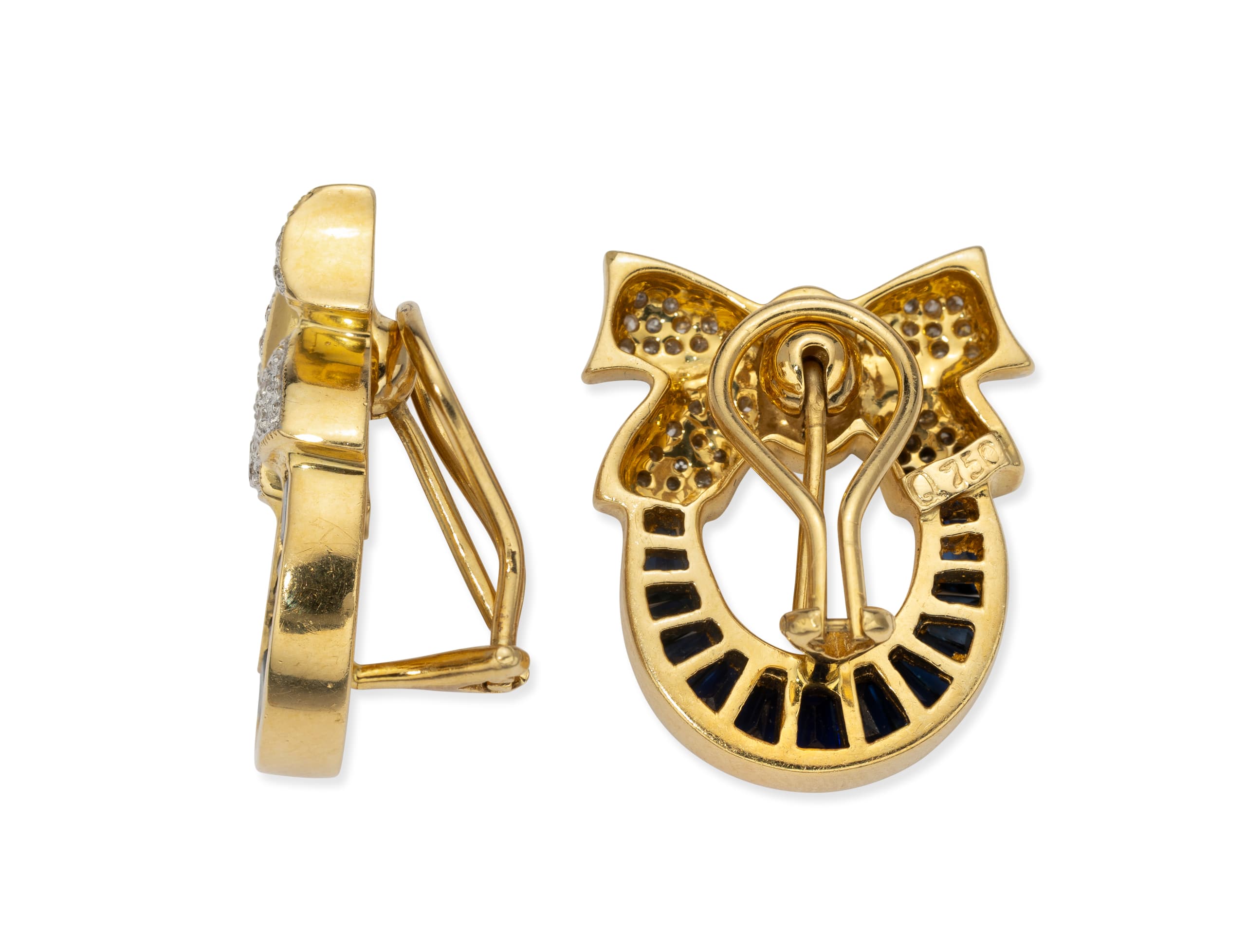 pair of 18k yellow gold earrings / ear clips set with diamonds weighing approximately 0.30 ct. and sapphires weighing approximately 1.50 ct.